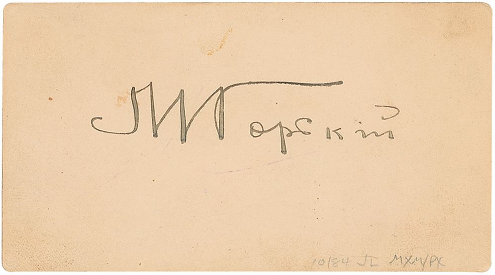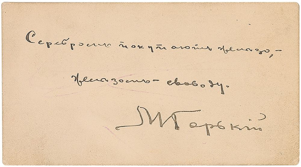 Important Russian/Soviet author and activist (1868–1936). Though his criticism of the Communist government led to a relationship marked by conflict and unease, he was ultimately embraced (though closely monitored) by the Stalinist regime, and Stalin himself was a pallbearer at Gorky’s funeral. AQS, in Russian, on an off-white 4 x 2.25 card. Gorky writes, in full: “With silver, iron is bought, with iron, Freedom.” Signed at the conclusion, “M. Gorki,” and signed again on the reverse, “M. Gorki.” In fine condition, with mild toning and a small pencil notation along bottom edge of reverse.