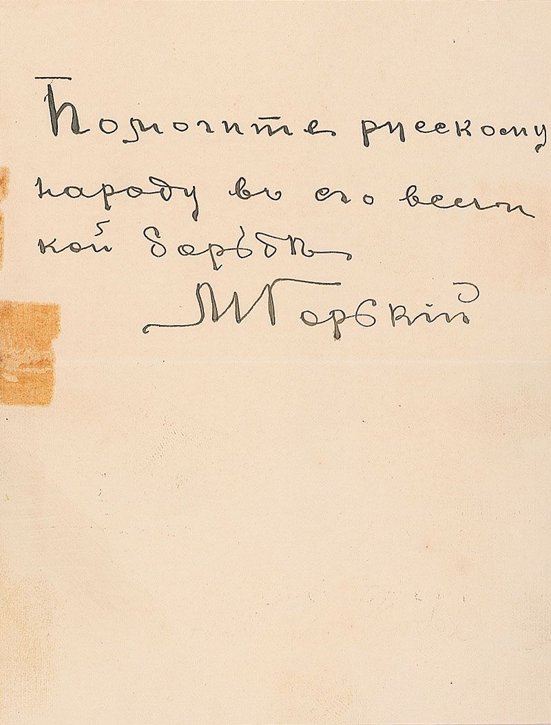 Important Russian/Soviet author and activist (1868–1936). Though his criticism of the Communist government led to a relationship marked by conflict and unease, he was ultimately embraced (though closely monitored) by the Stalinist regime, and Stalin himself was a pallbearer at Gorky’s funeral. ANS in Cyrillic, one page, 3.75 x 5, no date. Brief, boldly penned untranslated note. In fine condition, with tape remnant to left edge.