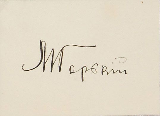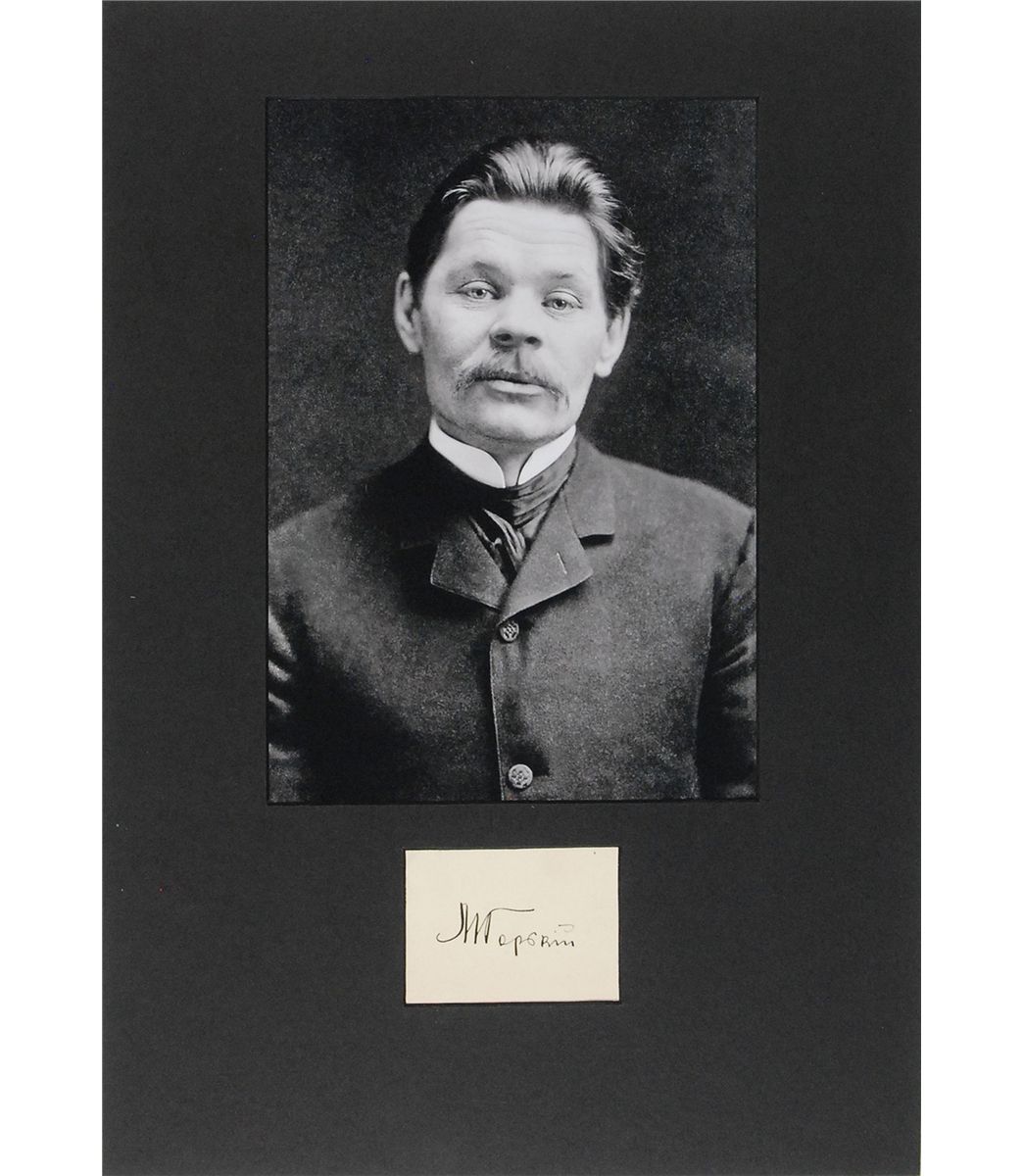 Bold ink signature in Cyrillic on an off-white 2 x 1.5 card. Matted with a photo of the Soviet author to an overall size of 8.25 x 11.75. In fine condition.