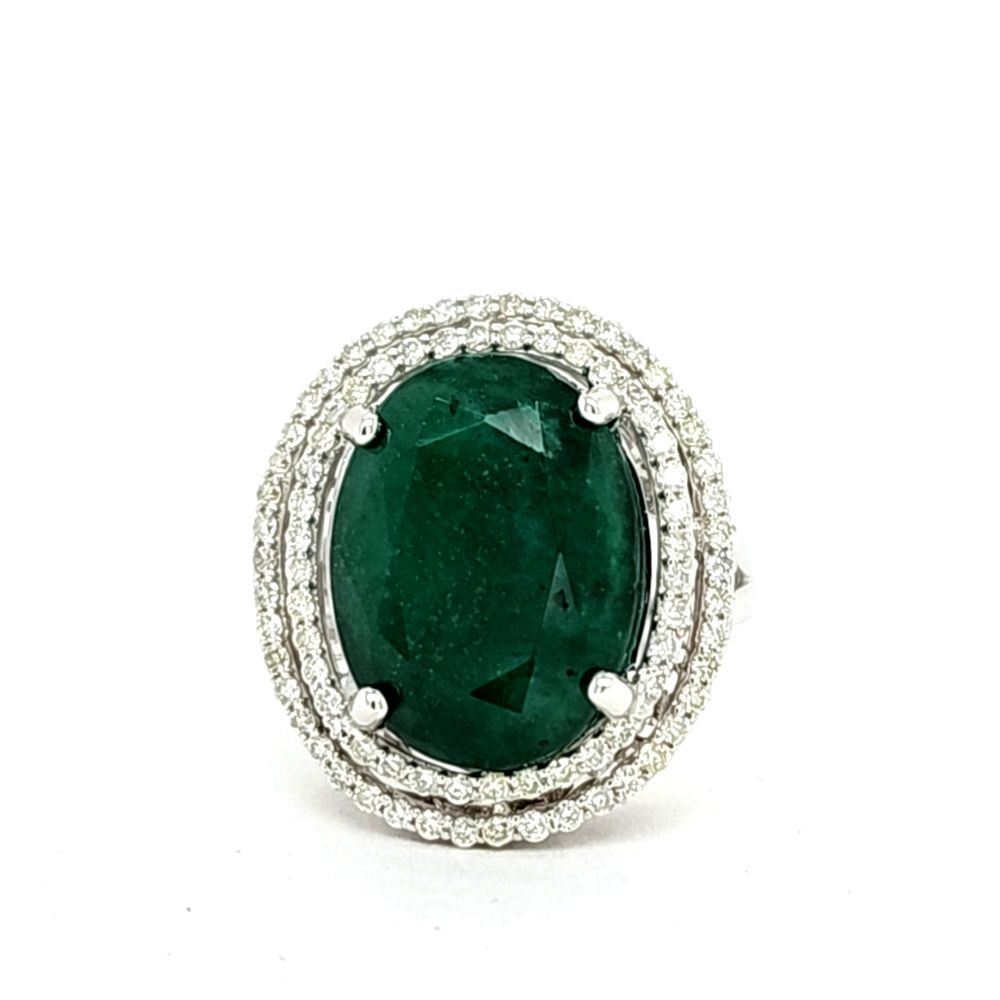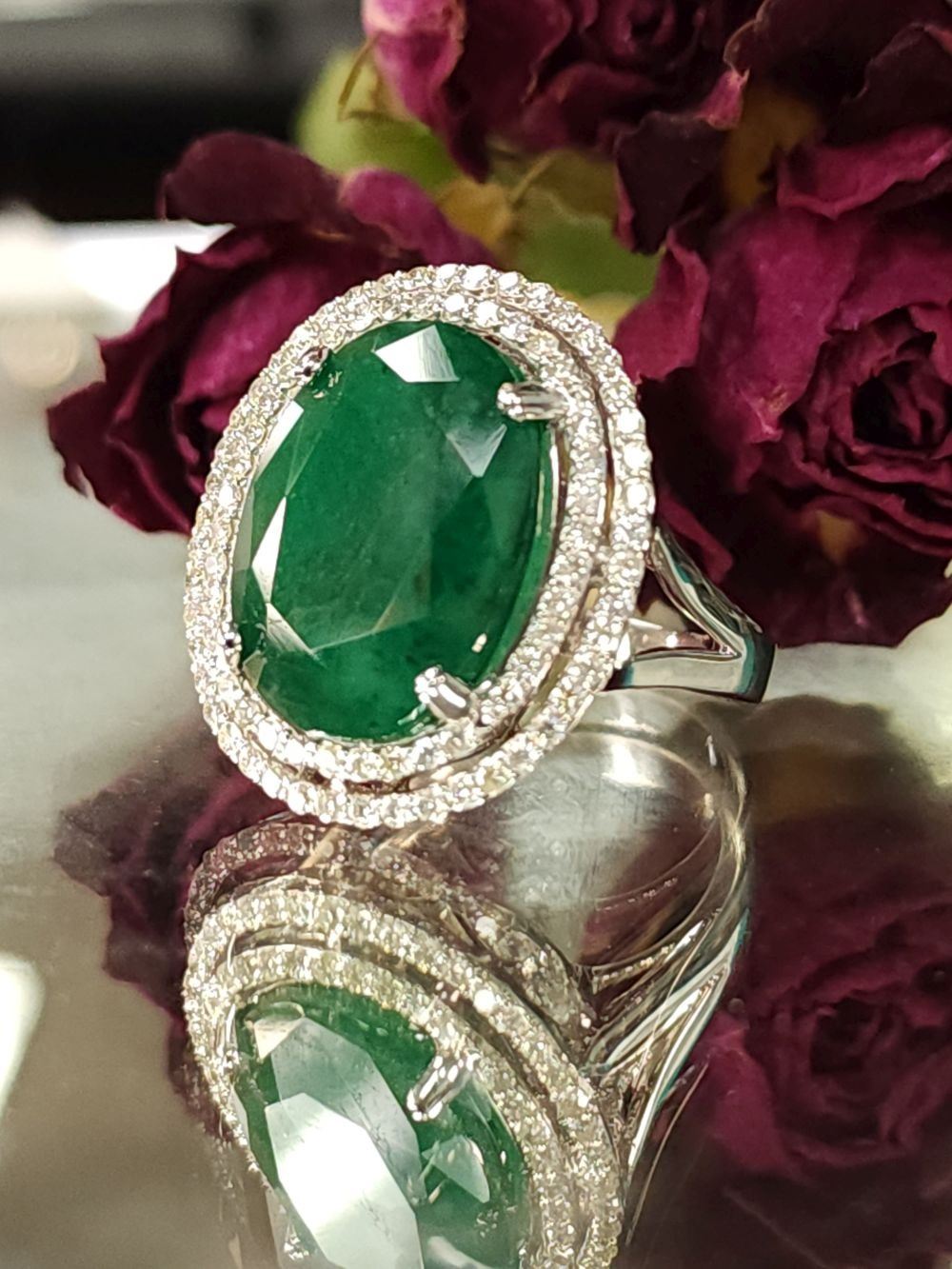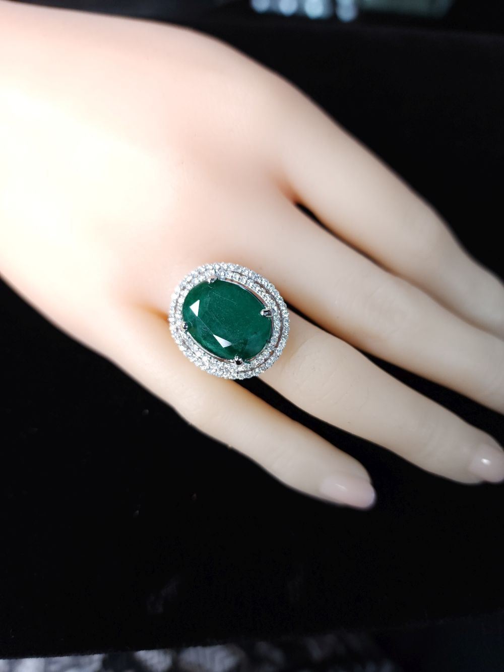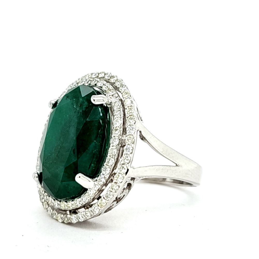 Genuine Emerald and Earth-Mined Diamond Ring.& nbsp; The incredible 9.88 carat oval-cut deep green emerald is prong set in a 14 karat white gold ring with .74 carats of round, brilliant-cut, G-H color, SI1-SI2 clarity diamonds in the floating double halo.& nbsp; This beautiful gemstone is raised with a swirled side gallery and supported with a bezel cup. The ring is US size 7.75 and has an approximate 2.5 mm shank that bears the Oscar Friedman hallmark. This ring can be resized for an additional $100, please allow an additional 10 days for shipping if we resize it. This ring is certified and appraised for& nbsp; $20,640.00 estimated retail replacement value.& nbsp; CHECK OUT THE PENDANT IN LOT 104 FOR AN EXQUISITE EMERALD AND DIAMOND PENDANT.& nbsp;