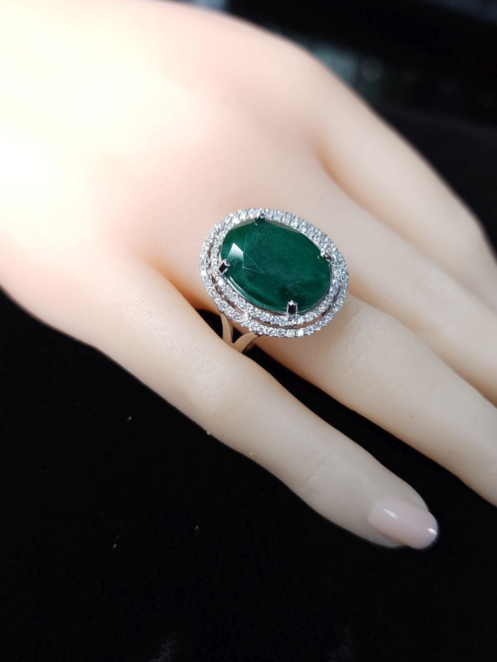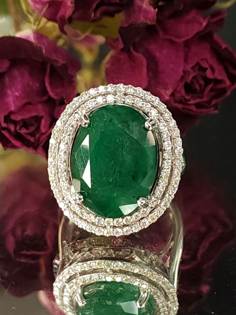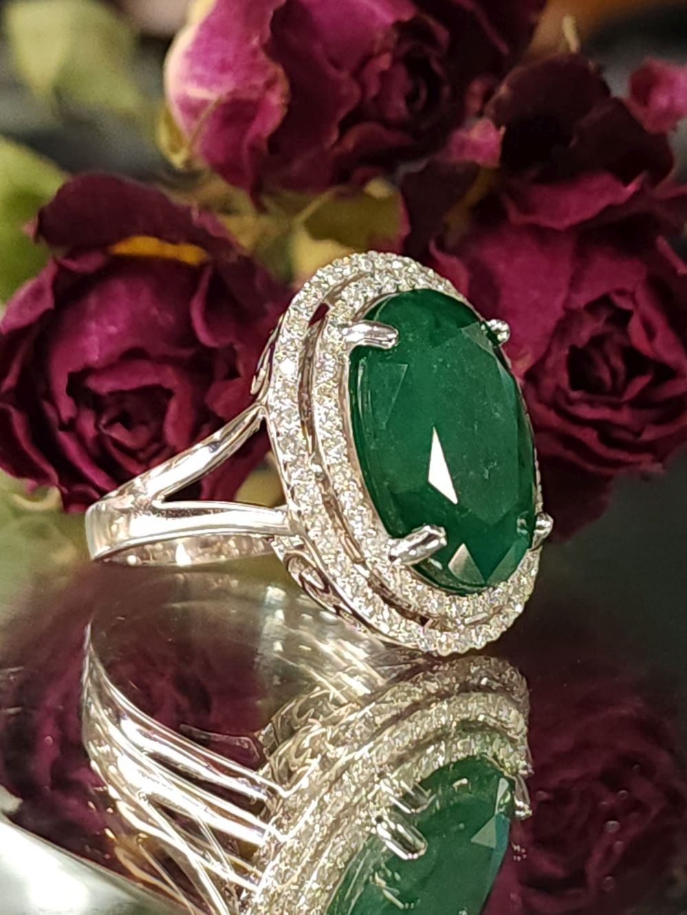 Genuine Emerald and Earth-Mined Diamond Ring.& nbsp; The incredible 9.88 carat oval-cut deep green emerald is prong set in a 14 karat white gold ring with .74 carats of round, brilliant-cut, G-H color, SI1-SI2 clarity diamonds in the floating double halo.& nbsp; This beautiful gemstone is raised with a swirled side gallery and supported with a bezel cup. The ring is US size 7.75 and has an approximate 2.5 mm shank that bears the Oscar Friedman hallmark. This ring can be resized for an additional $100, please allow an additional 10 days for shipping if we resize it. This ring is certified and appraised for& nbsp; $20,640.00 estimated retail replacement value.& nbsp; CHECK OUT THE PENDANT IN LOT 104 FOR AN EXQUISITE EMERALD AND DIAMOND PENDANT.& nbsp;