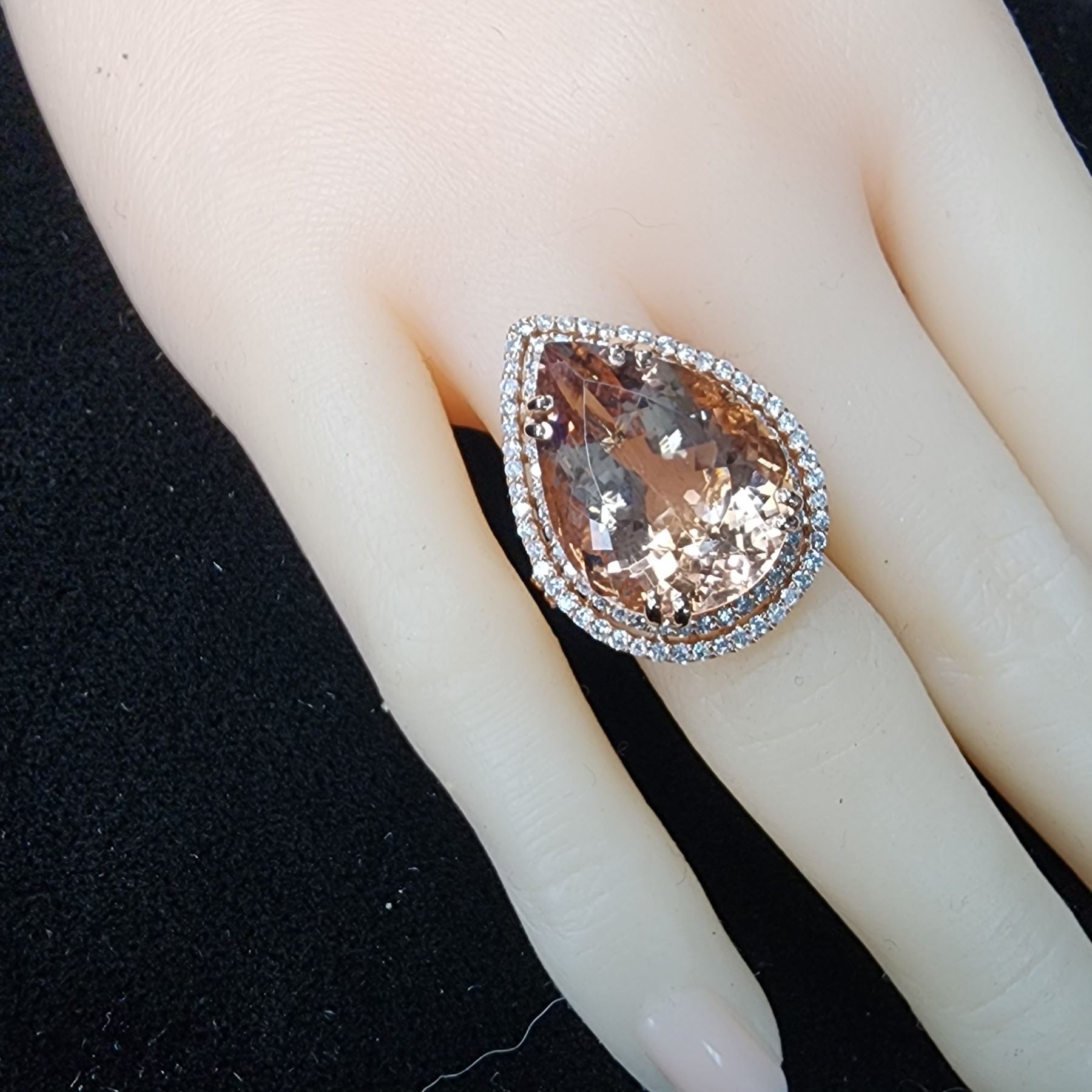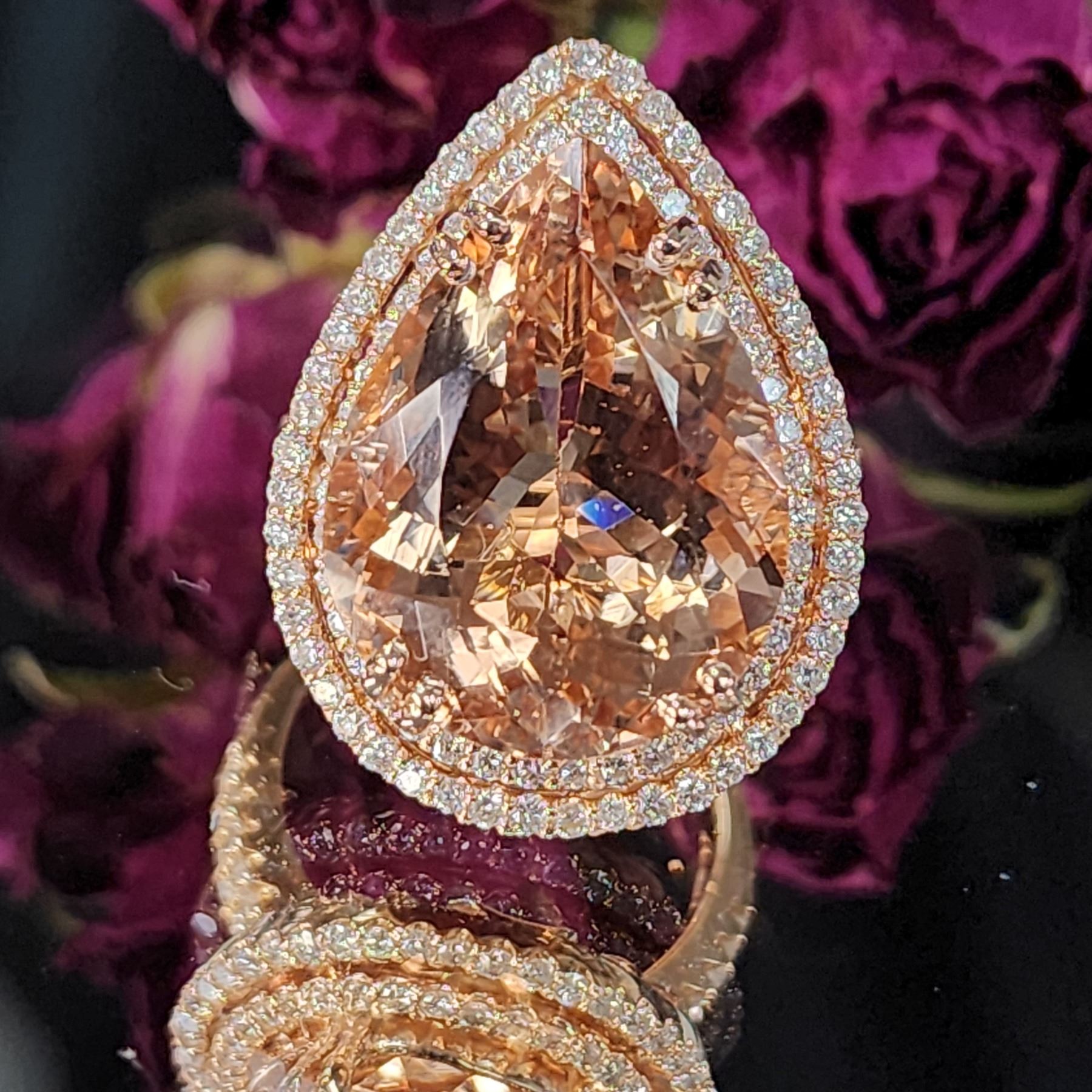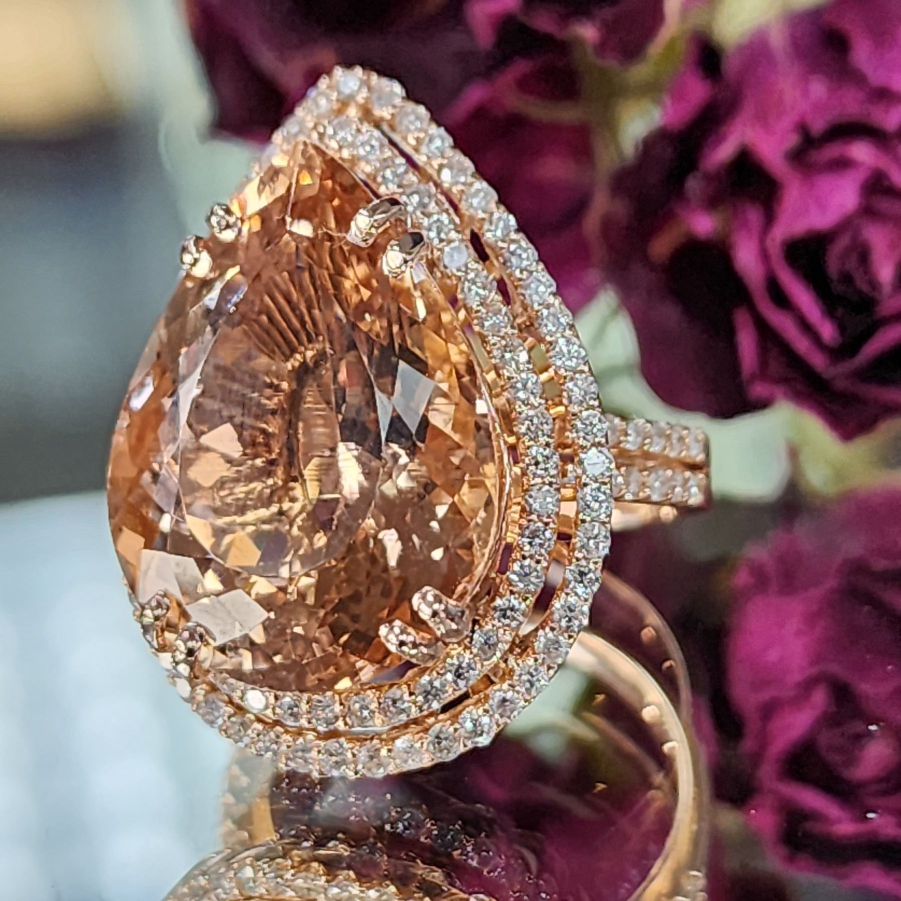 Genuine Morganite and Earth-Mined Diamond Ring.& nbsp; Pretty as a peach!& nbsp; A peachy colored 15.06 carat pear-shaped Morganite is double-prong set in this 14 karat rose gold ring with 1.06 carats of round, brilliant-cut, G-I color, SI-1 to SI2 diamonds in the double floating halo and slightly split shoulders.& nbsp; The ring is US size 6.5 and has an approximate 2.6 mm shank and an ornate, yet supportive under gallery. This ring can be resized for an additional $100, please allow an additional 10 days for shipping if we resize it. This ring is certified and appraised for $18,000.00 estimated retail replacement value.
