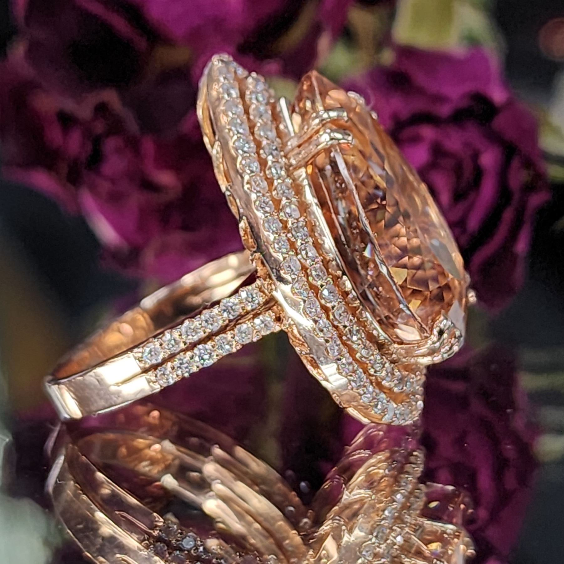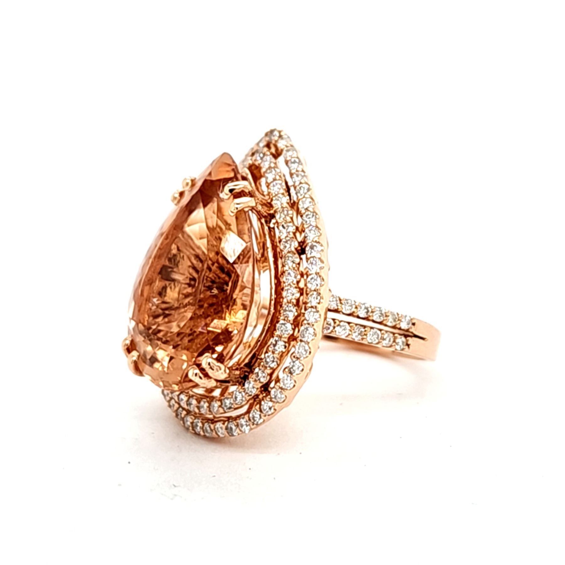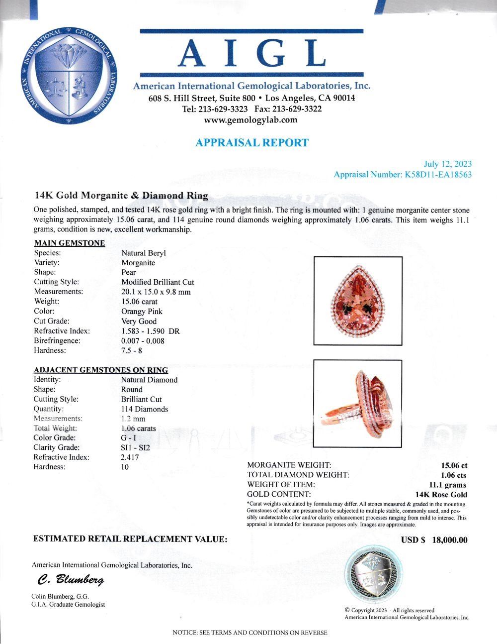 Genuine Morganite and Earth-Mined Diamond Ring.& nbsp; Pretty as a peach!& nbsp; A peachy colored 15.06 carat pear-shaped Morganite is double-prong set in this 14 karat rose gold ring with 1.06 carats of round, brilliant-cut, G-I color, SI-1 to SI2 diamonds in the double floating halo and slightly split shoulders.& nbsp; The ring is US size 6.5 and has an approximate 2.6 mm shank and an ornate, yet supportive under gallery. This ring can be resized for an additional $100, please allow an additional 10 days for shipping if we resize it. This ring is certified and appraised for $18,000.00 estimated retail replacement value.