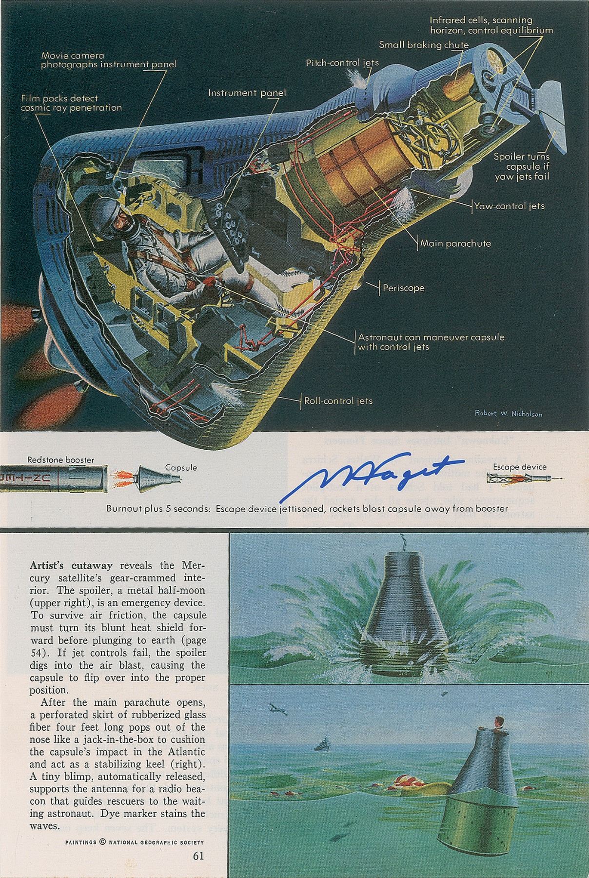 Designer of the Mercury capsule (1921-2004) who also contributed to the Gemini and Apollo spacecraft. Color semi-glossy 6.75 x 10 magazine photo of a cut section of the Mercury capsule, signed in blue felt tip, "M. Faget." In fine condition, with scattered light creasing.