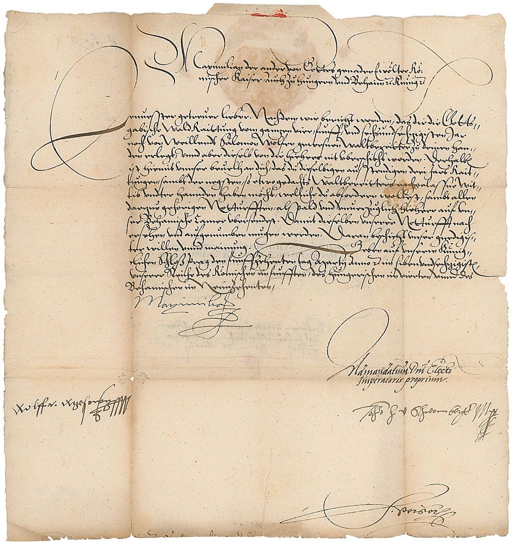 Member of the House of Habsburg (1527–1576) who was Holy Roman Emperor from 1564 until his death; his policies of religious neutrality allowed peace between the empire’s Roman Catholics and Protestants after the first struggles of the Reformation. Manuscript DS in German, one page, 12.5 x 13, March 1567. Untranslated. The embossed paper seal affixed to the reverse remains crisp with paper loss to just the upper corner. Storage folds with small splits at intersections and expected document wear, otherwise fine condition.