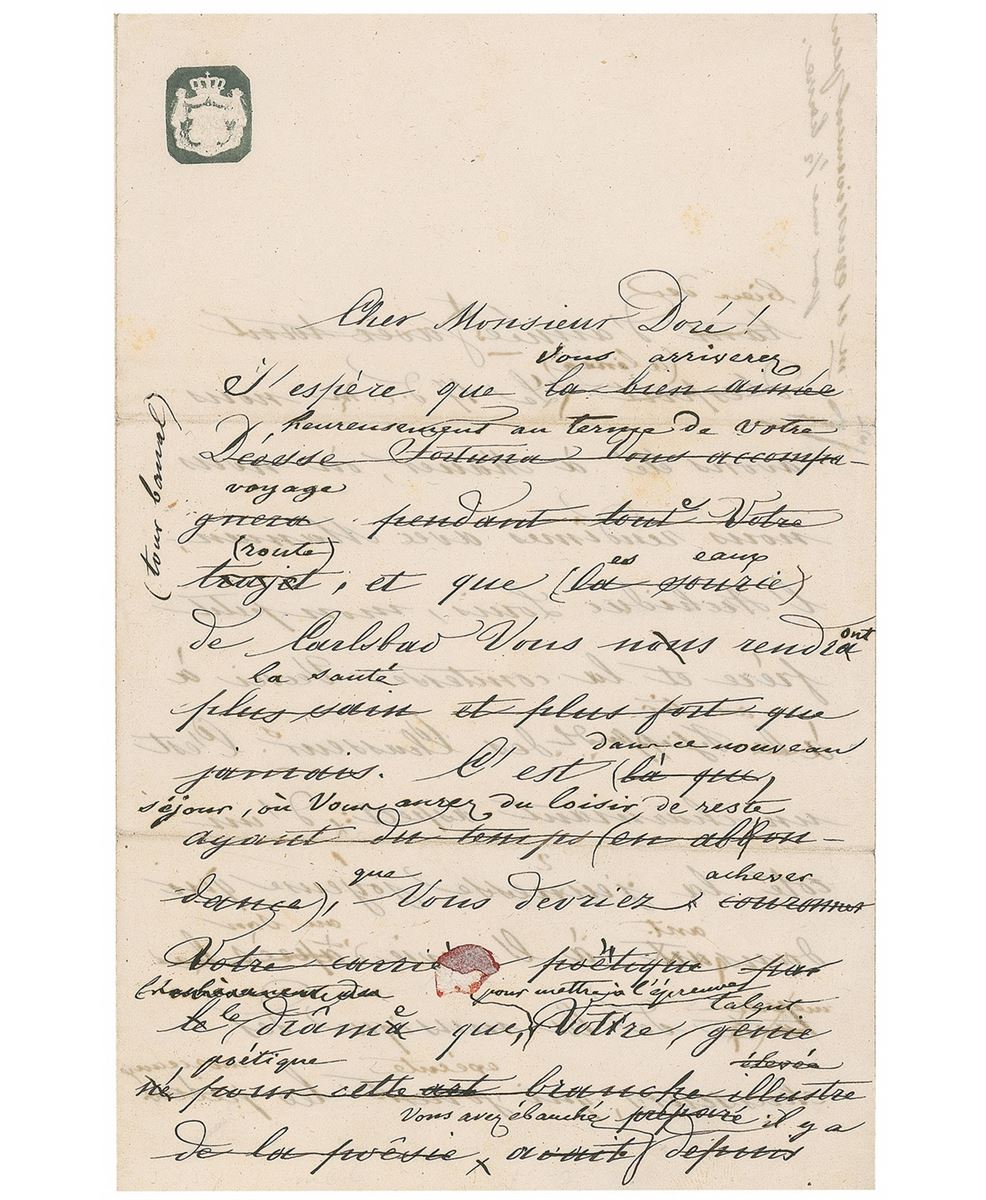King of Bavaria (born 1756) from 1806 until his death in 1825. Handwritten letter in French, unsigned, four pages on two adjoining sheets, 5.25 x 8, no date. A corrected draft letter written to his French teacher Hippolyte Dore, who is on holiday at the spa of Karlsbad. The teacher’s rigorous corrections change the young student’s good wishes into more neutral phrases: the travel companion “Fortuna” is deleted, while the poetic “genie” attested to Dore is replaced with “talent.” Maximilian also describes his visit to a shooting ground in Mauer near Vienna, as well as the mysterious murder of a coachman (translated), “we discovered the first traces of blood…but the unfortunate corpse was found on the iron bridge leading to Penzing Hitzinger, the body was pierced by two stab wounds.” Much of Maximillian’s writing neatly bisected by the teacher’s hand, a small red wax seal remnant to first page, trivial creasing, and show-through from writing to opposing sides, otherwise fine condition.