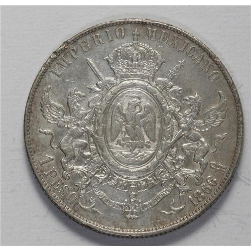 <B>Maximilian Peso 1866-Mo,</B></I> KM-387, XF, light color, scarce.<BR><I>From the Monedas Oro Collection</B></I><BR><BR><b>Shipping:</b> Coin/Currency (<a target="_blank" href="http://www.heritageauctions.com/common/shipping.php">view shipping information</a>)