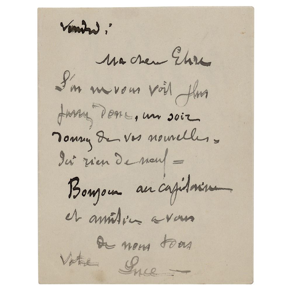 Desirable ALS in French, signed “Luce,†one page, 4 x 5.25, no date. Addressed to "Eliza," an untranslated handwritten letter from Maximilien Luce, who adds an intricate landscape sketch on the reverse of the integral second page. In fine condition.