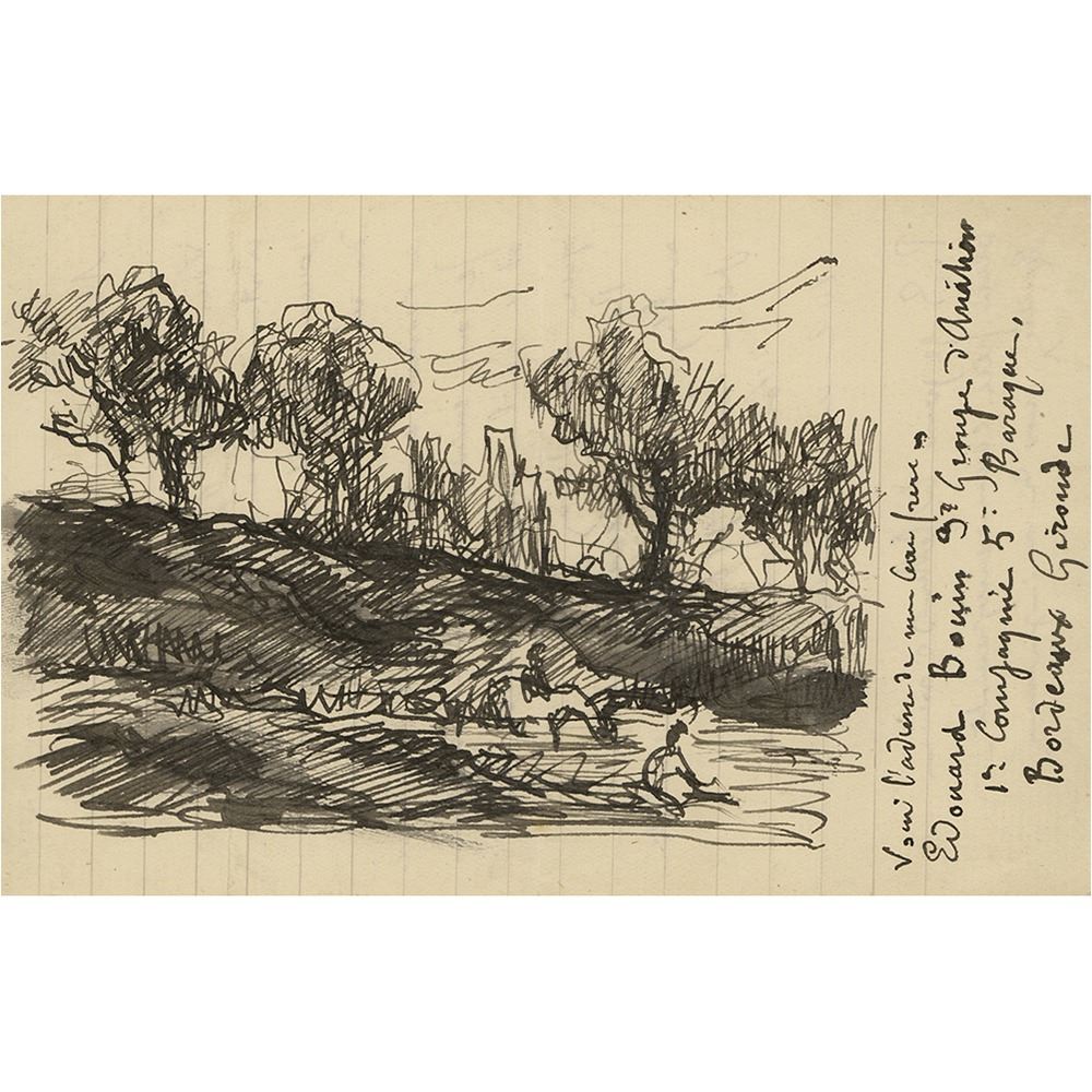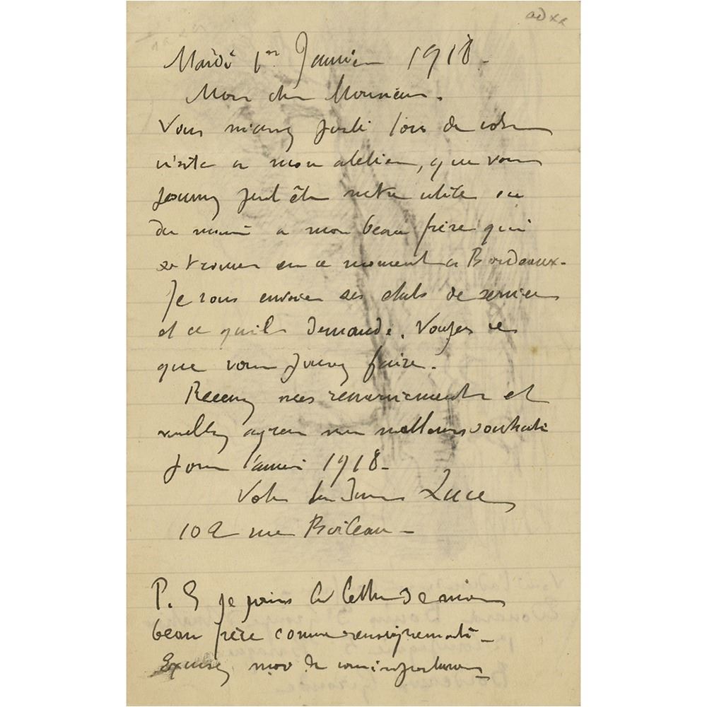 ALS in French, signed “Luce,†one page, 4.25 x 6.5, January 1, 1918. Untranslated handwritten letter by Luce, with two fabulous original ink sketches drawn on the reverse: one of a landscape scene, and one of several figures together. In fine condition.