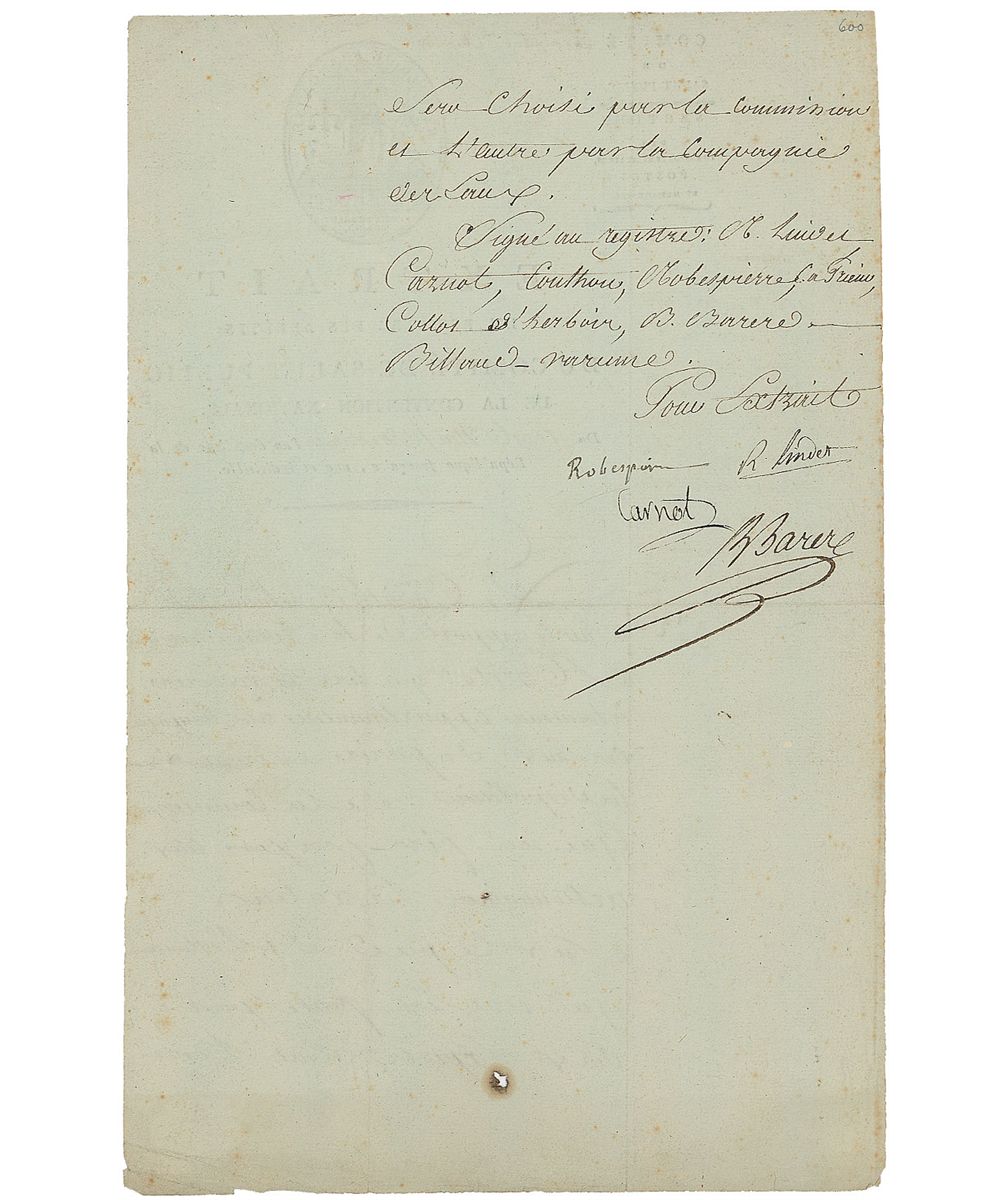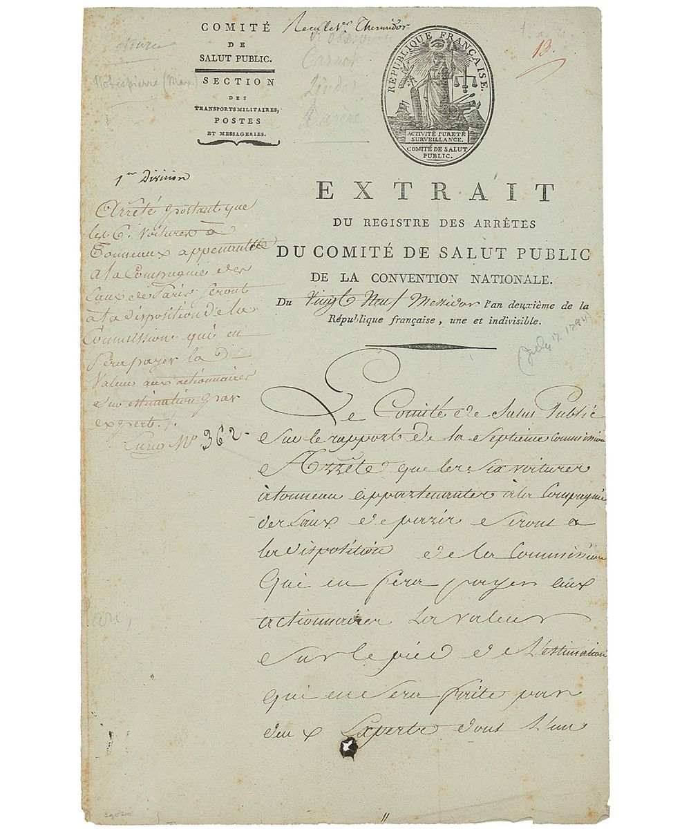 Fanatical idealist leader of the French Revolution (1758–1794) who was arrested, tried, and executed for the ‘Reign of Terror.’ Partly-printed DS in French, signed “Robespierre,” one page both sides, 8 x 12.25, July 17, 1794. Order, on official letterhead of the Committee of Public Safety, to commandeer six wagons belonging to the Water Company of Paris “which were to be taken over by the Committee of Public Safety,” for transport services, possibly for transport of the condemned. Signed at the conclusion by Robespierre and four other officials. In fine condition, with intersecting folds, one through a single letter of signature, and some light edge creasing and toning. Around the time of this letter, shortly after the violent ‘Reign of Terror,’ 1400 enemies of the Revolution were sent to their deaths.