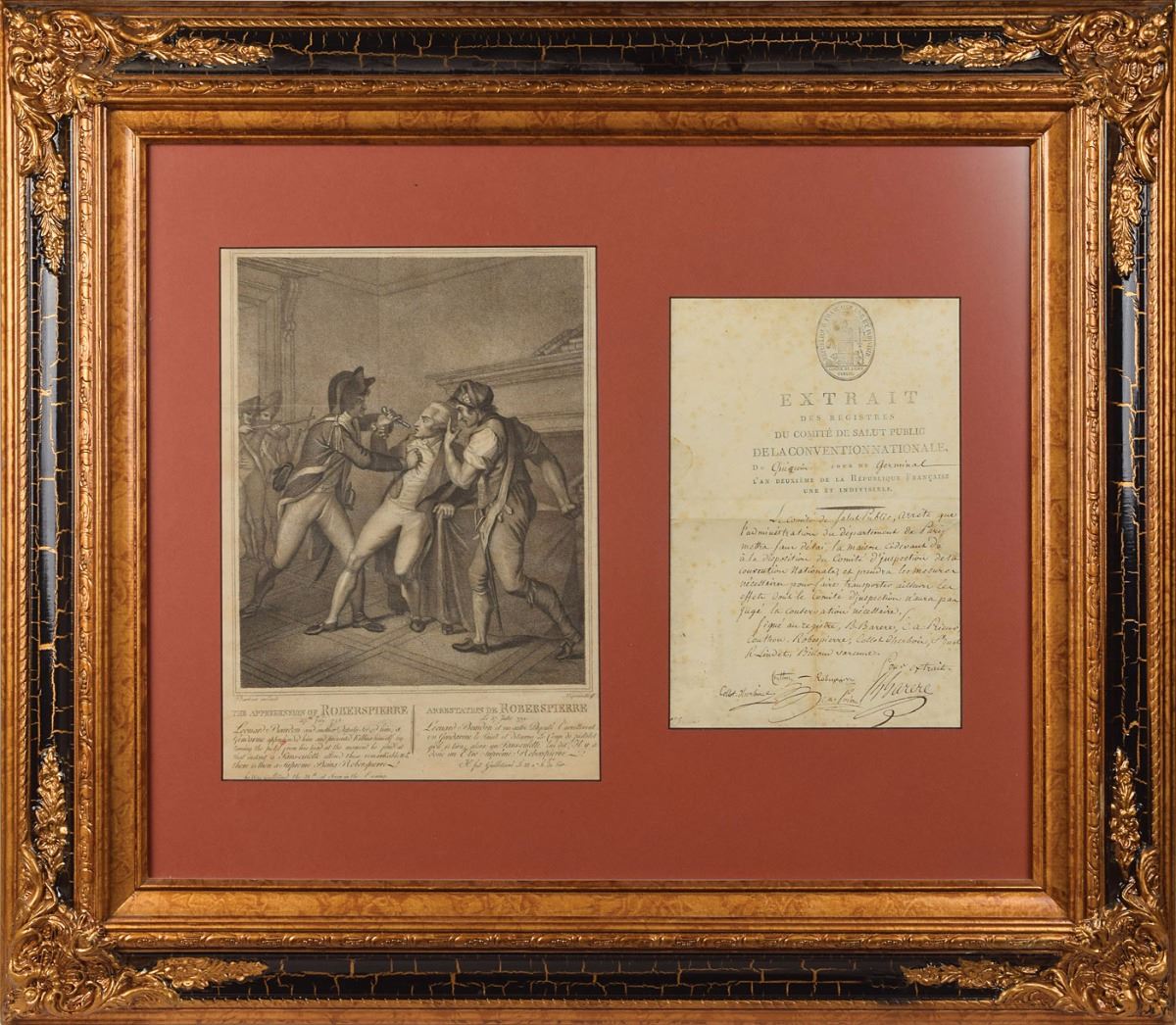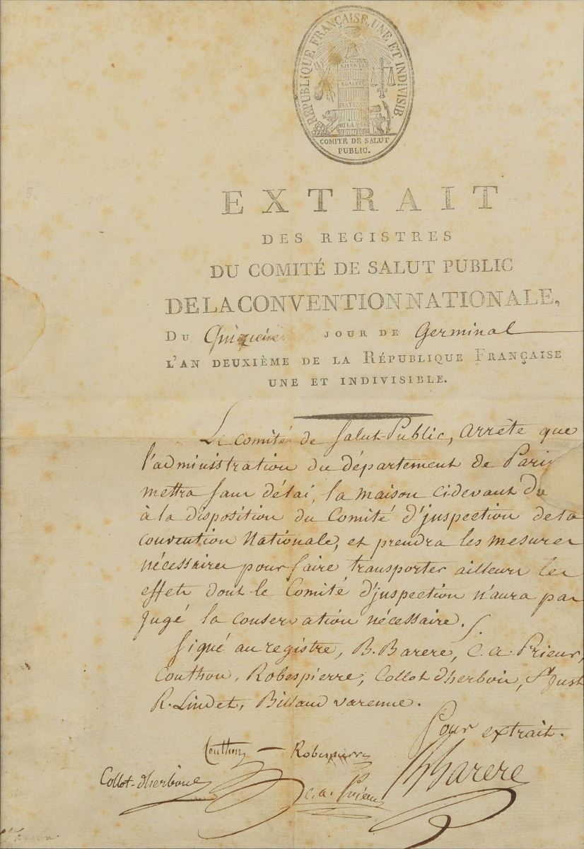 Fanatical idealist leader of the French Revolution (1758–1794) who was arrested, tried, and executed for the 'Reign of Terror.' Partly-printed DS, signed “Robespierre,” one page, 7.5 x 11.5, no date but circa 1793–1794. Untranslated French National Convention document, signed at the conclusion by five important members of the Revolutionary government: Maximilien Robespierre; Bertrand Barere; Georges Couthon; Claude Antoine, comte Prieur-Duvernois; and Jean-Marie Collot d'Herbois. Matted and framed with an engraving entitled 'The Apprehension of Robespierre' to an overall size of 32 x 28. In very good to fine condition, with scattered overall foxing.