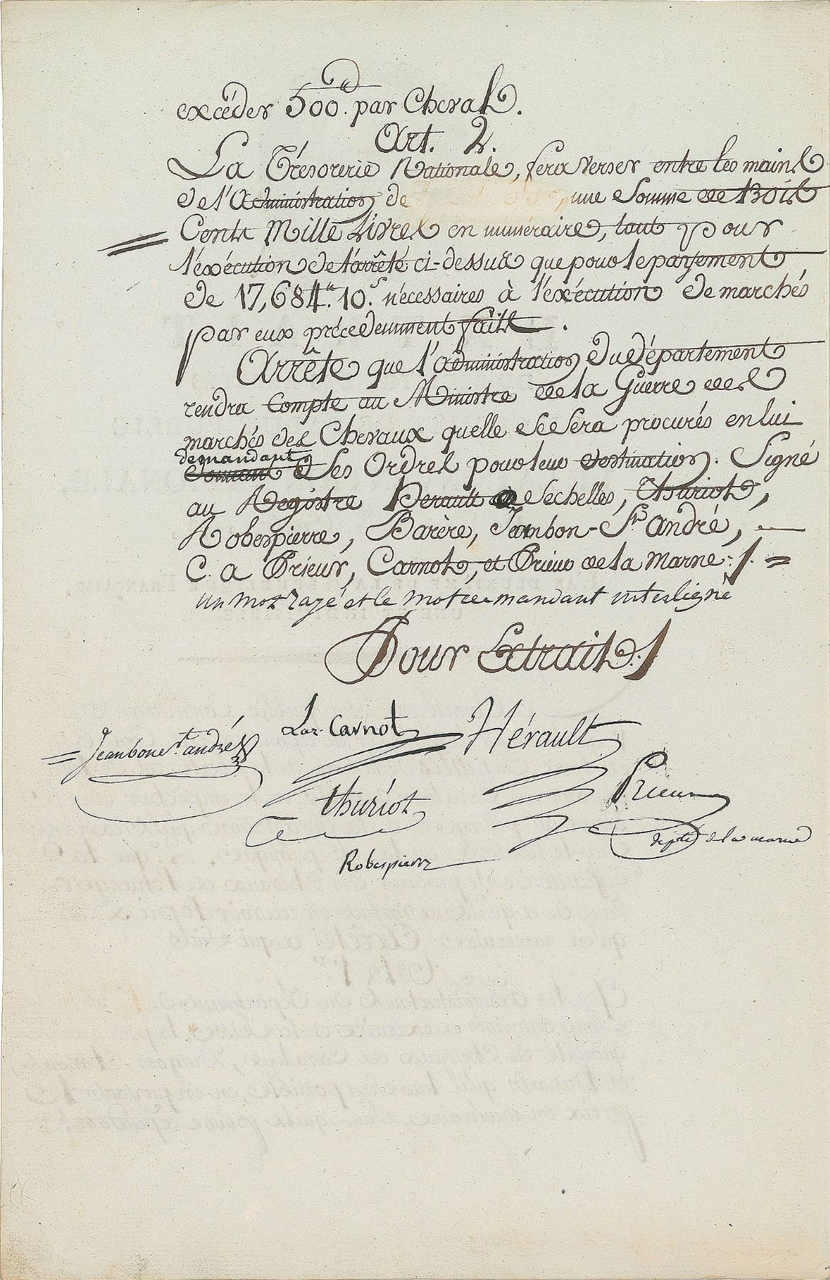 Partly-printed DS in French, signed “Robespierre,” one page both sides, 8 x 12.5, August 29, 1793. An extract from the Register of the Decrees of the Committee of Public Safety of the National Convention, in which the committee considers (translated) “that the surest means to repulse the tyrants and their satellites from the land of liberty is to confront them with a cavalry capable of preventing them from engaging in the plundering and devastation that they practice on the territory of the Republic.” The succeeding two articles authorize the attainment from Switzerland “the greatest possible quantity of horses for cavalry, dragoons, chasseurs, and hussars, by paying for them in cash” in the amount of “three hundred thousand livres in cash, both for the carrying out of the present decree and the payment of 17, 684.10 livres necessary in order to carry out sales.” Signed at the conclusion in ink by Robespierre, as well as seven other committee members, including Herault de Sechelles, Thuriot de la Rosiere, Bertrand Barere, Jeanbon Saint-Andre, C. A. Prieur, Pierre-Louis Prieur, and Lazare Nicolas Marguerite Carnot. In fine condition, with two small areas of thin paper where single words have been eradicated. With Robespierre serving as its Parisian representative, the establishment of the Committee of Public Safety took its final form on September 6, 1973, a date that infamously marked the beginning to the French Revolution’s Reign of Terror. A fascinating document boasting several signatures of the period’s ruthless de facto executive government as they prepared to stifle internal opponents and support French military forces.