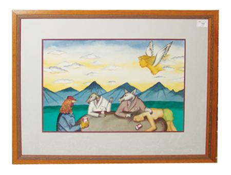 Signed original watercolor of dressed animals with angels and mountains in the background. We couldn't find the signature but the owner's notes attribute it to Javier.