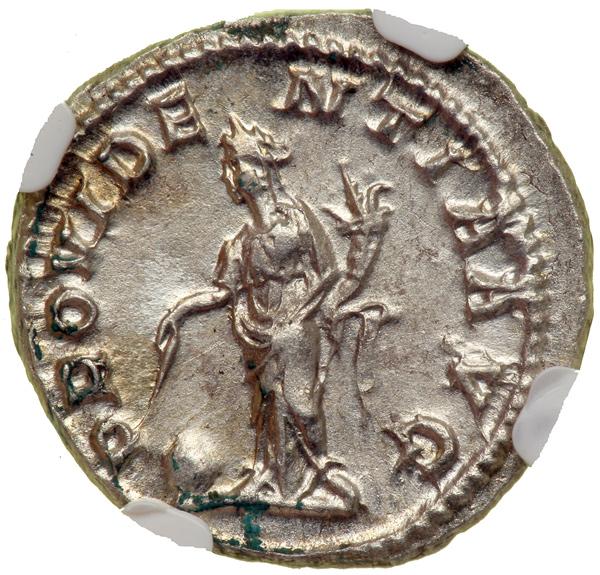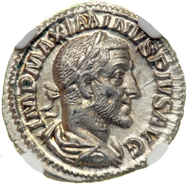 Maximinus I, AD 235-238. AR Denarius minted at Rome, c. March AD 235 - c. January AD 236. Laureate, cuirassed and draped bust right of Maximinus I. Reverse: Providentia standing left, holding wand over globe, and cornucopiae. RIC 13; C. 77. NGC graded MS: Strike 5/5; Surface 5/5.