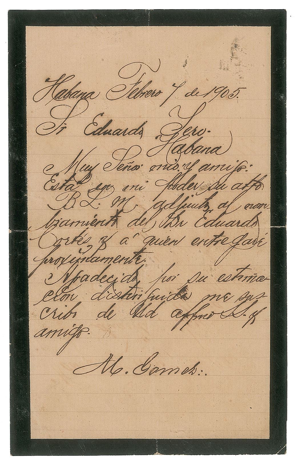 Major General (1836–1905) in Cuba's Ten Years' War against Spain who was also Cuba's military commander during their War of Independence. LS in Spanish, signed “M. Gomez,” one black-bordered page, 5 x 8, February 7, 1905. Untranslated letter written from Havana and addressed to Cuban Minister Eduardo Yero. In very good to fine condition. Accompanied by a full letter of authenticity from PSA/DNA.