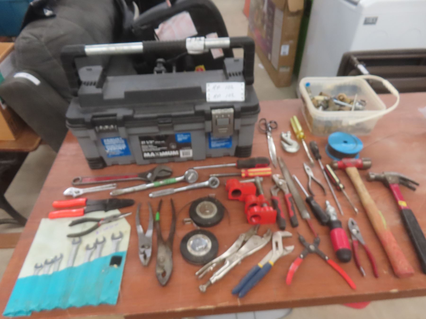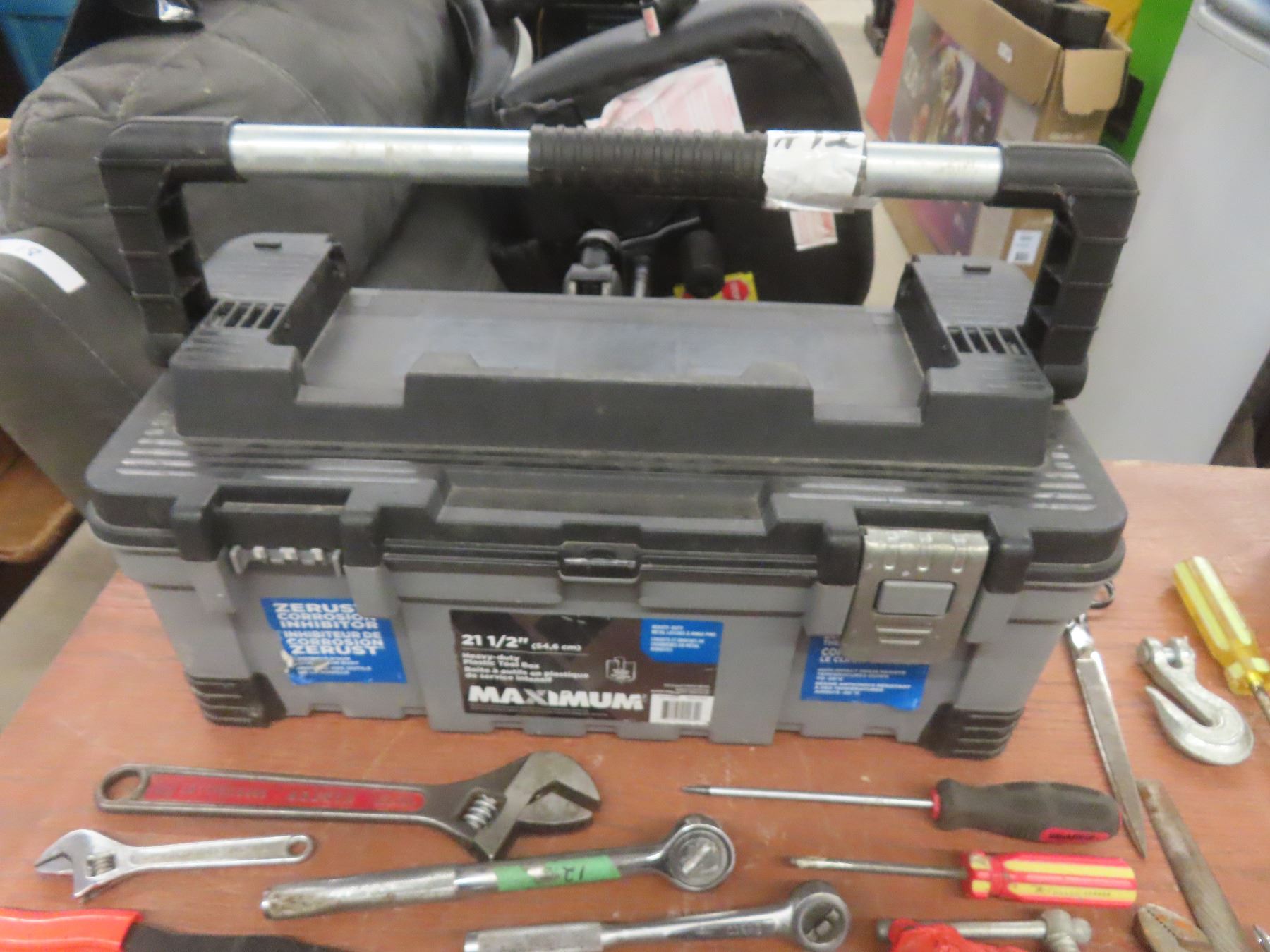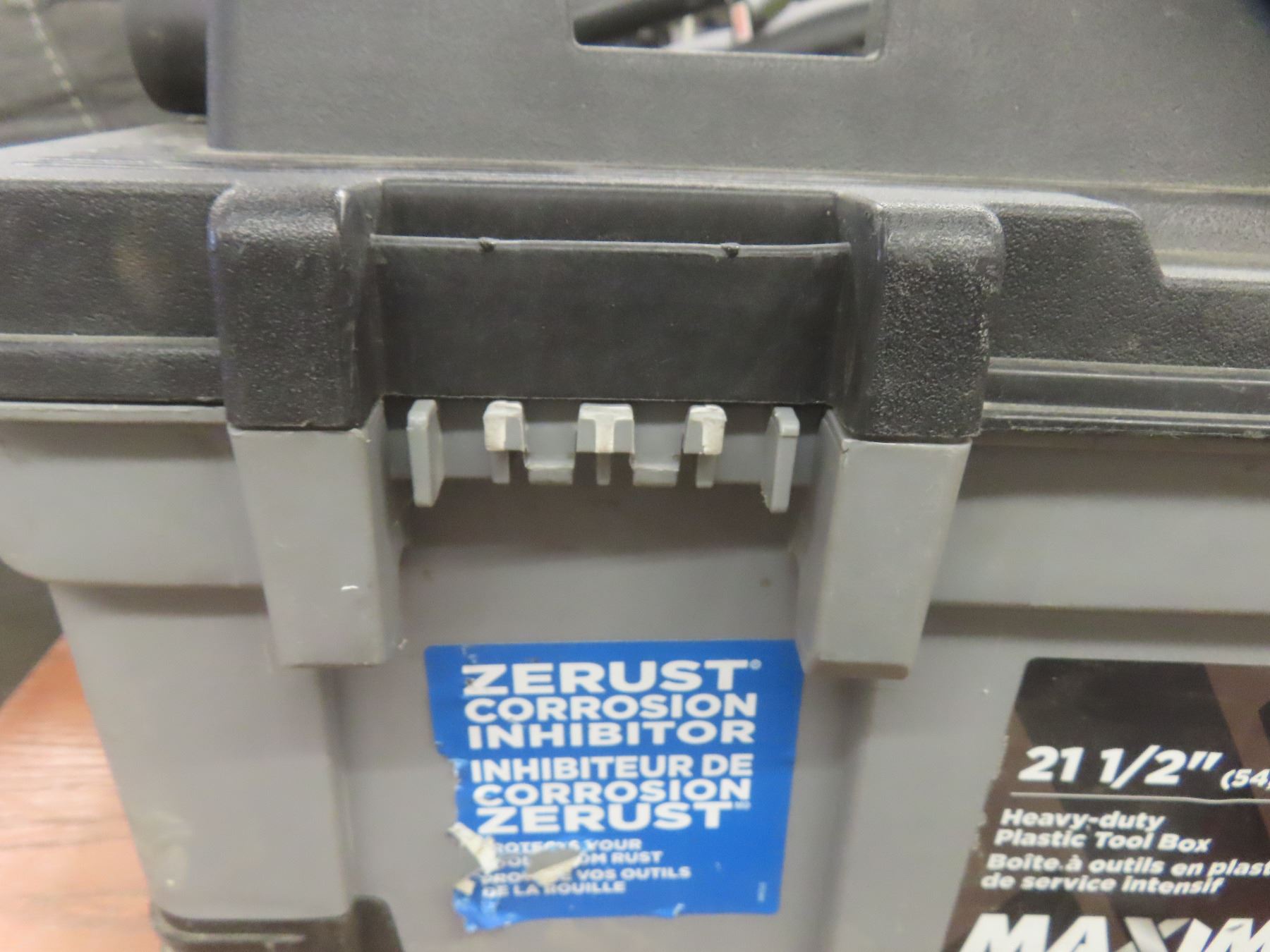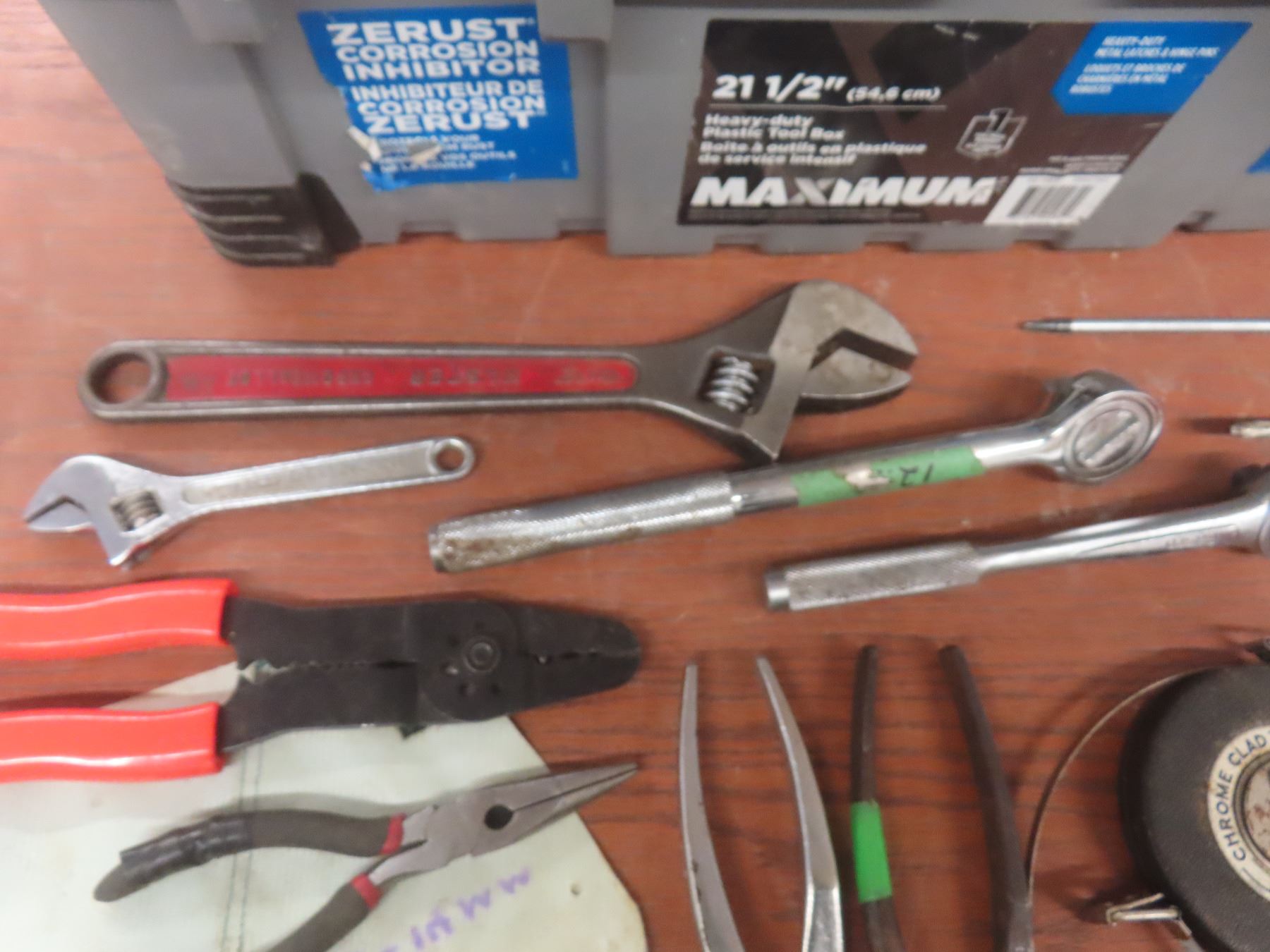 Maximum Tool Box with Assorted Tools Including Pliers, Wrenches, Hammer, and Tape Measure – Missing Locking Clasp