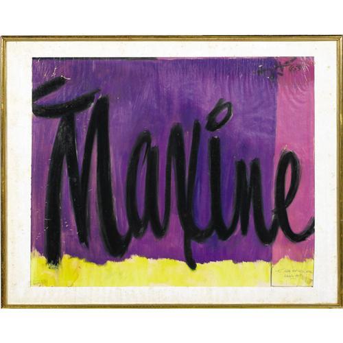 <B>"Maxine" Painting to Ava Gardner.</B></I> A 19.5" x 16" abstract oil painting, "Maxine," in splashy black, blue and yellow colors, inscribed "To Ava for good luck -- Harry Hut" by the artist. The painting relates to Ava's performance as Maxine Faulk in Tennessee Williams' <I>Night of the Iguana</B></I> (1964), which co-starred Richard Burton, Deborah Kerr and Sue Lyon, and for which Ava won the San Sebastian International Film Festival Best Actress Award. From the personal collection of Ava Gardner. Framed to an overall size of 24" x 19" and in Fine to Very Fine condition with some soiling. <I>From the Ava Gardner Estate.</B></I><BR><BR><b>Shipping:</b> Other (oversized items, group lo (<a target="_blank" href="http://www.heritageauctions.com/common/shipping.php">view shipping information</a>)