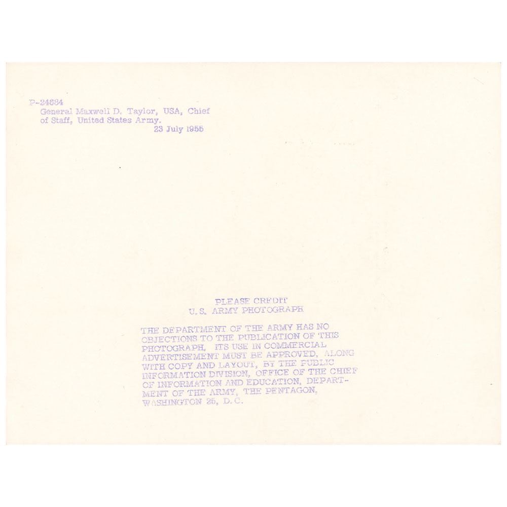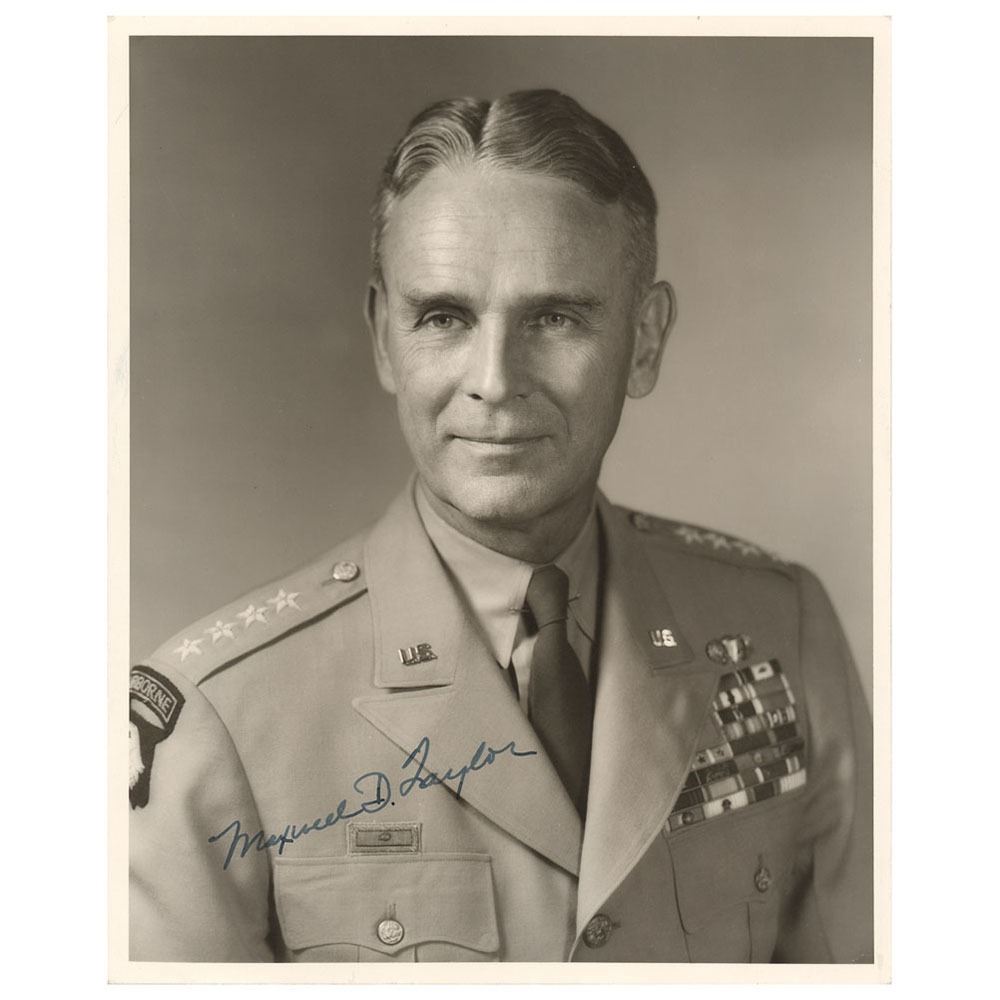 Vintage matte-finish 8 x 10 U.S. Army portrait of Maxwell D. Taylor in his four-star uniform photo, signed in fountain pen. Reverse bears a U.S. Army Photograph credit stamp. In fine to very fine condition.