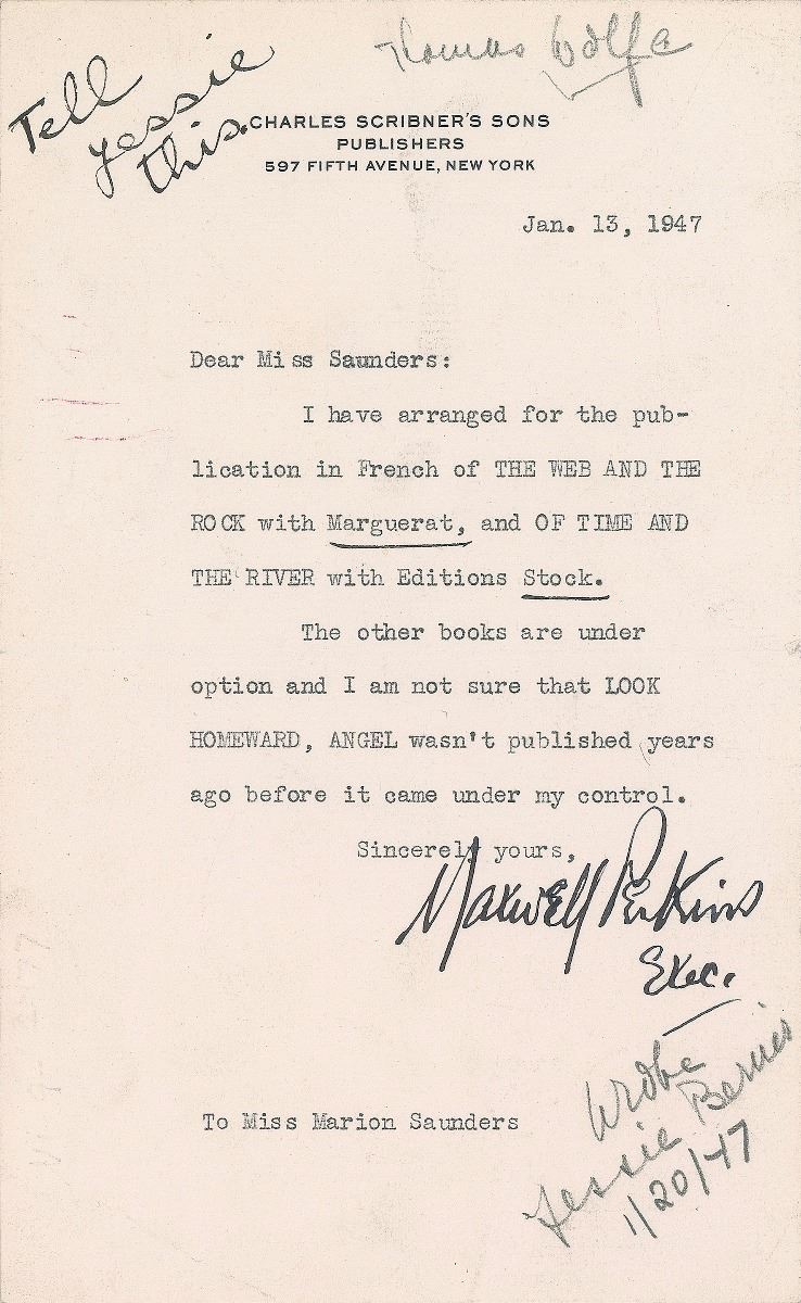 Book editor of the early 20th century (1884–1947) who is best remembered as the editor who discovered and nurtured American authors Ernest Hemingway, F. Scott Fitzgerald, and Thomas Wolfe. Rare TLS signed “Maxwell Perkins, Exec.,” one page, 4.75 x 7.75, Charles Scribner's Sons letterhead, January 13, 1947. Letter to Marion Saunders, in full: "I have arranged for the publication in French of The Web and the Rock with Marguerat, and Of Time and the River with Editions Stock. The other books are under option and I am not sure that Look Homeward, Angel wasn't published years ago before it came under my control." Perkins adds a handwritten brief note to the upper left, "Tell Jessie this." The letter also features secretarial pencil notations. In fine condition.