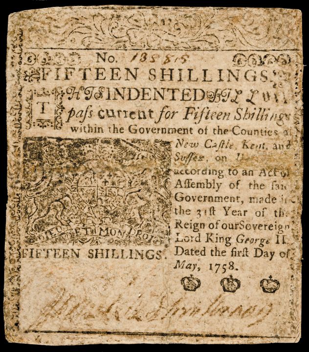 May 1, 1758 Benjamin Franklin Printed Delware Colonial Currency Note