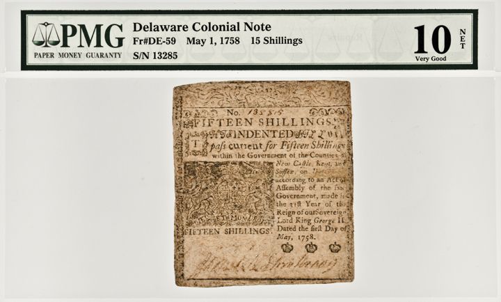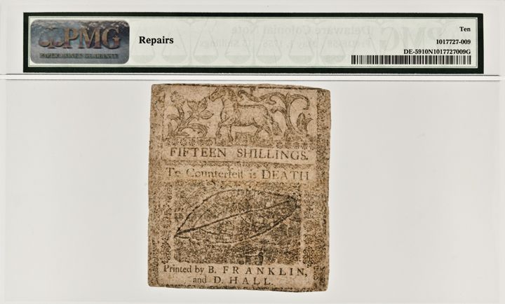 Delaware. May 1, 1758. Fifteen Shillings. “Printed by B. FRANKLIN” Issue. “Horse” vignette. Conservation. PMG net graded VG-10 (Our grade Choice Fine+).