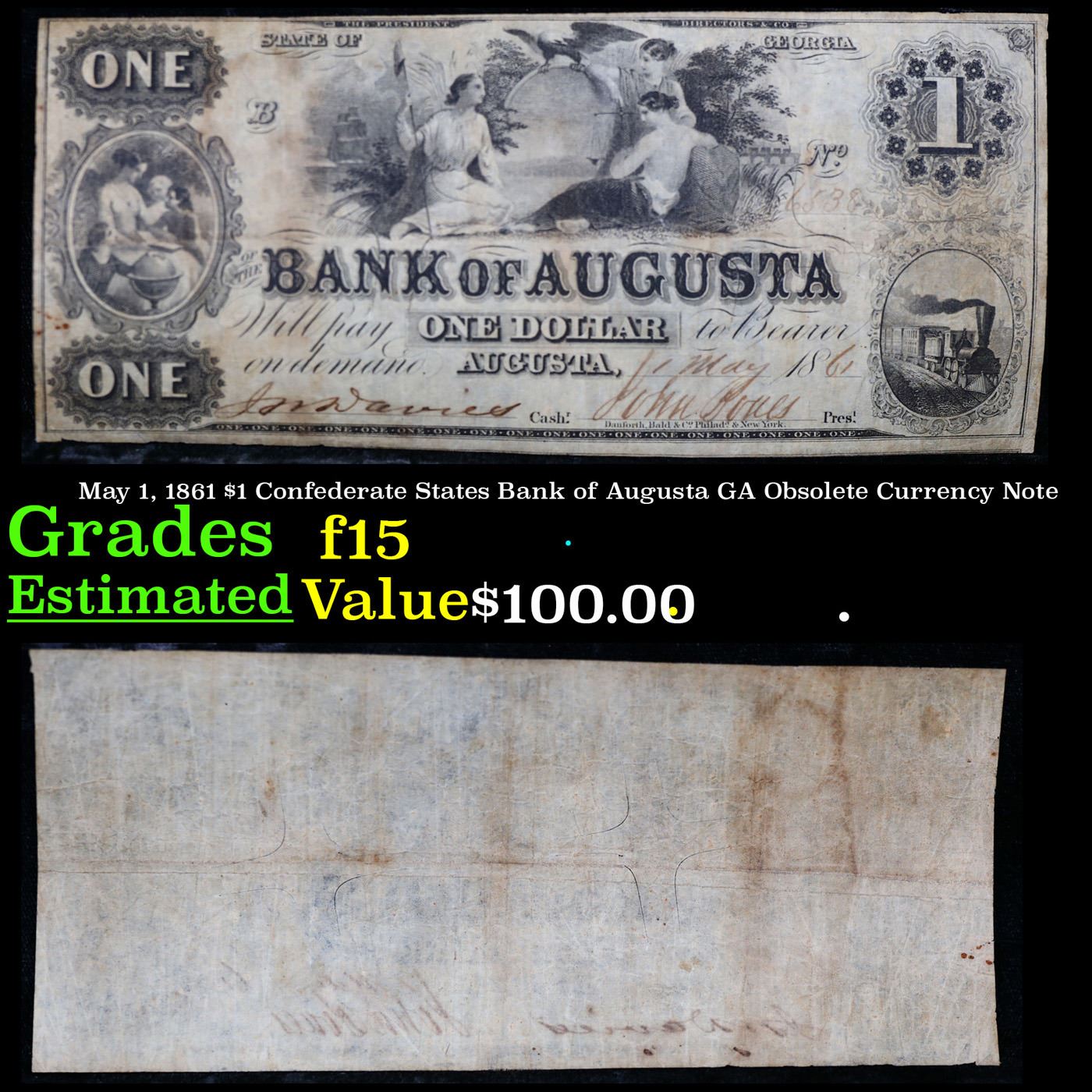 May 1, 1861 $1 Confederate States Bank of Augusta GA Obsolete Currency Note Grades f+.