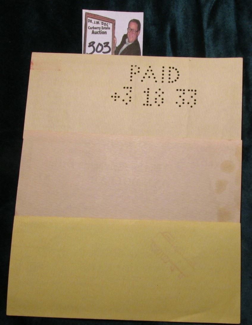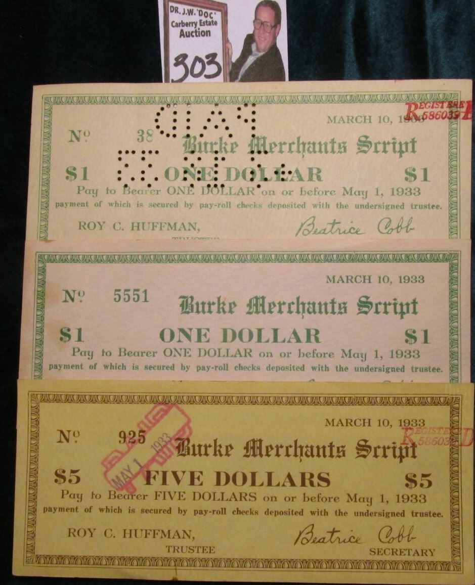 May 1, 1933 Burke, N.C. Depression Scrip, (2) MS #: NC51-1.A & (1) NC51-5. Burke County, Issuer: Burke Merchants Script (2) $1 (one red stamp cancel "Registered 486039, other AU, uncancelled & $5 Scrip, hole cancelled, and red stamped "Registered 586030". Size: 156 mm x 67 mm. Krause value in 1984 was $75.00.
