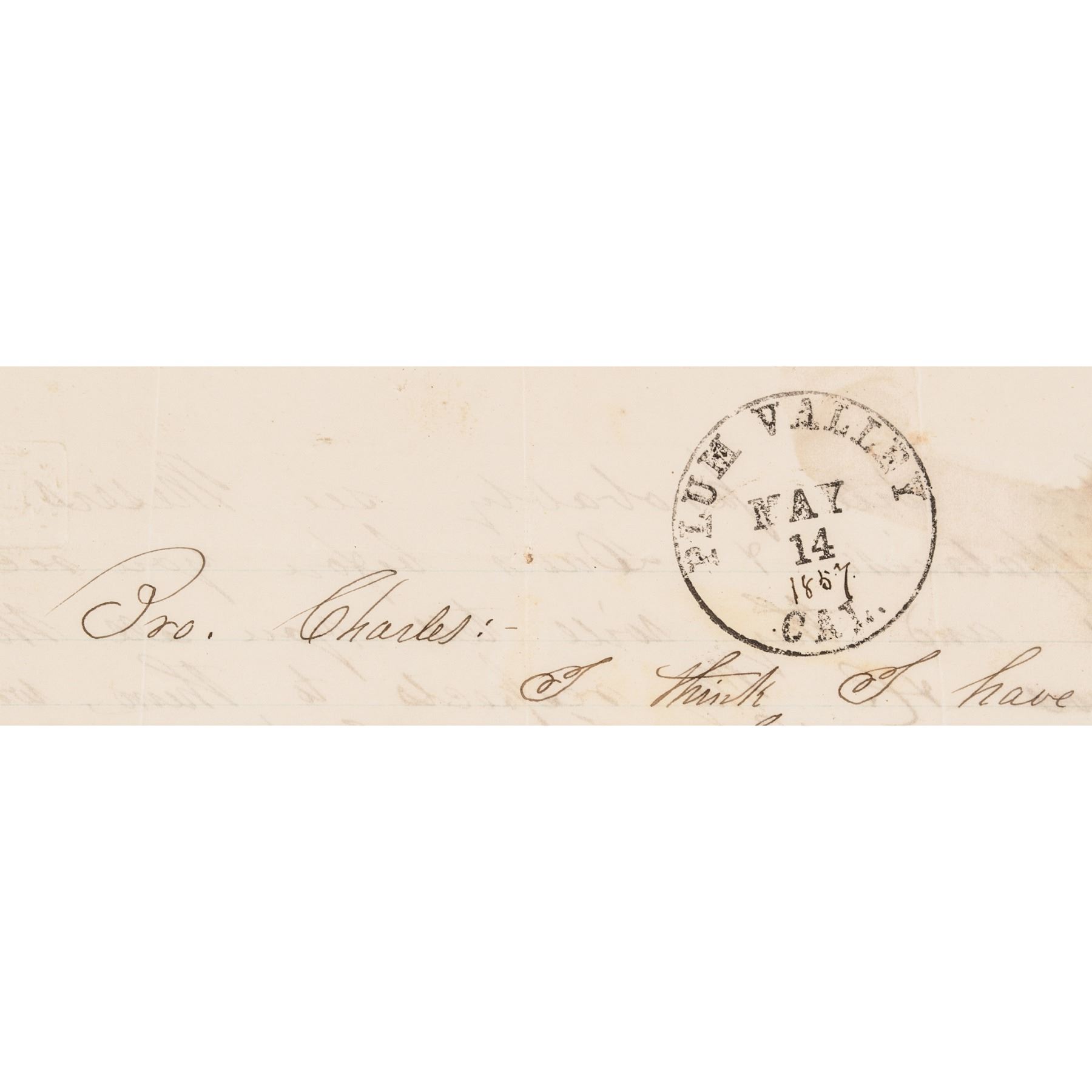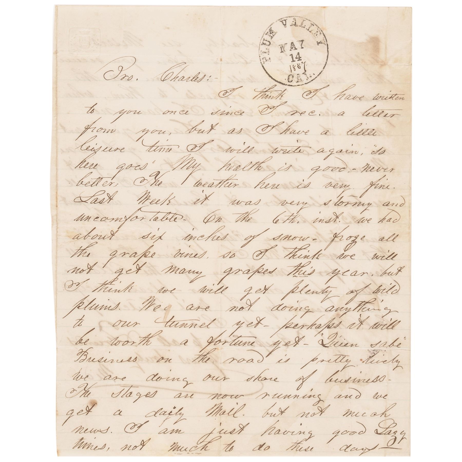 May 14, 1857-Postmarked, “PLUM VALLEY - CAL” Late Spring California Fruit Provisions Period Letter of family correspondence during the 1850s California Gold Rush, Very Fine.
