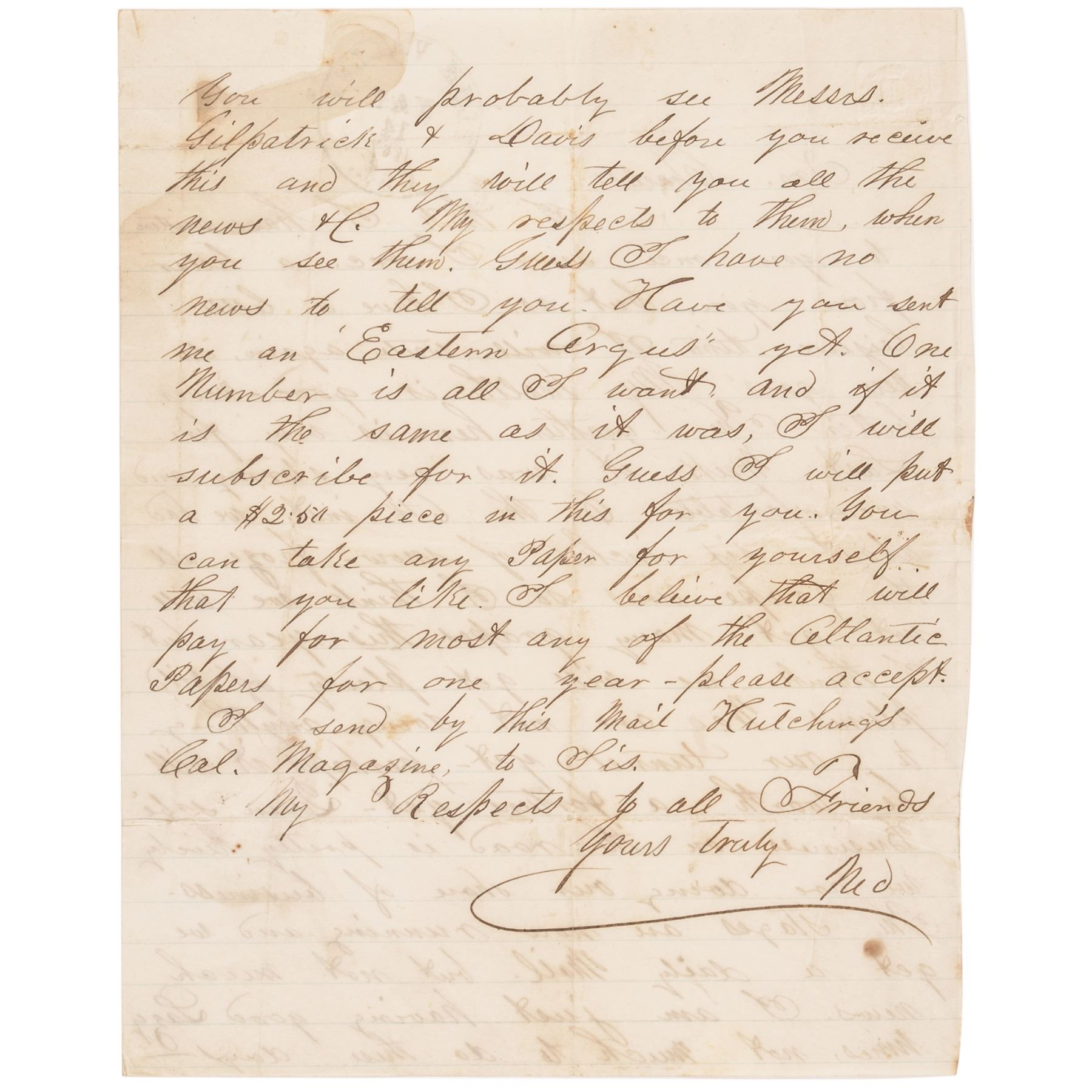 This Letter measures 6.5" x 8.5" and has been folded over several times. On the first page of the letter, there is a ornate crown and wreath design imprinted in the upper left hand corner. Some minor foxing on the second page. The quality writing is readable and the rich brown he ink is well preserved on the clean wove period paper.