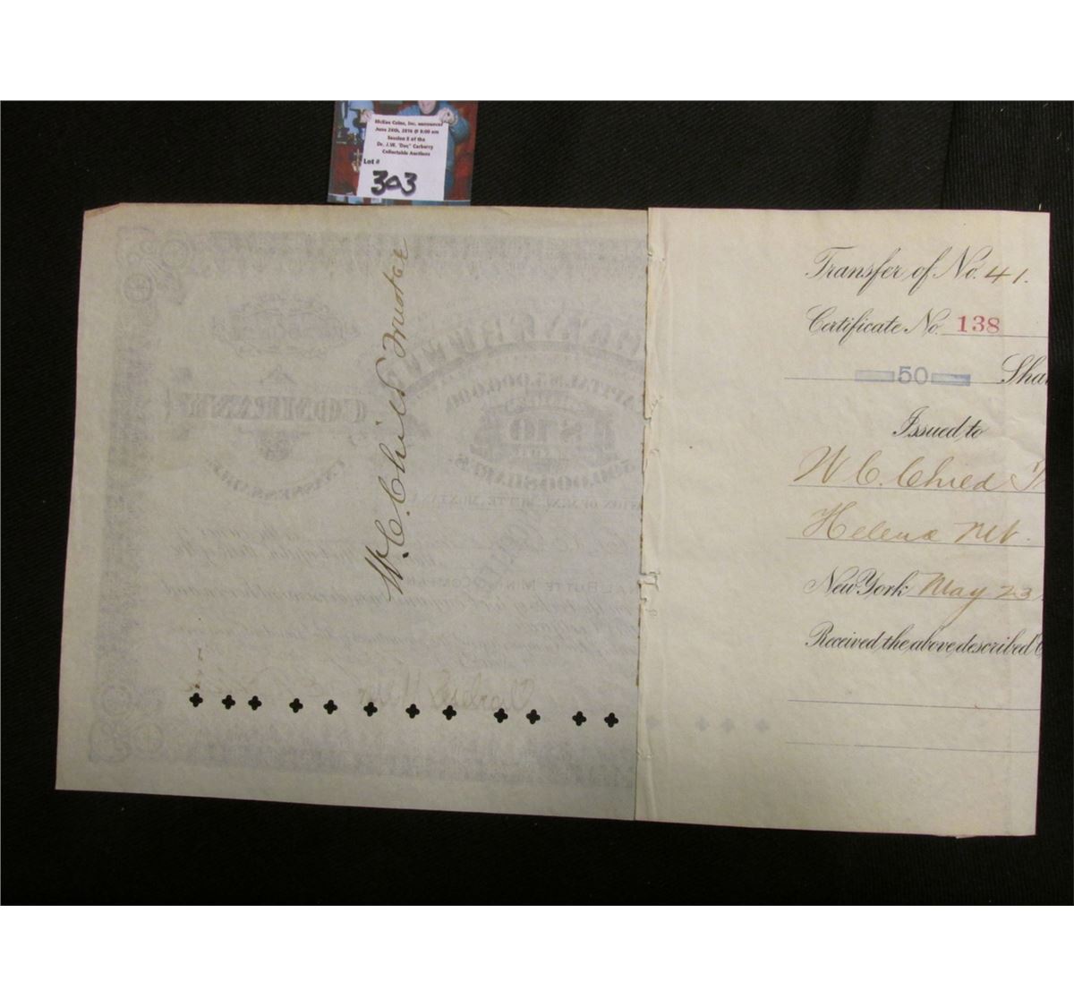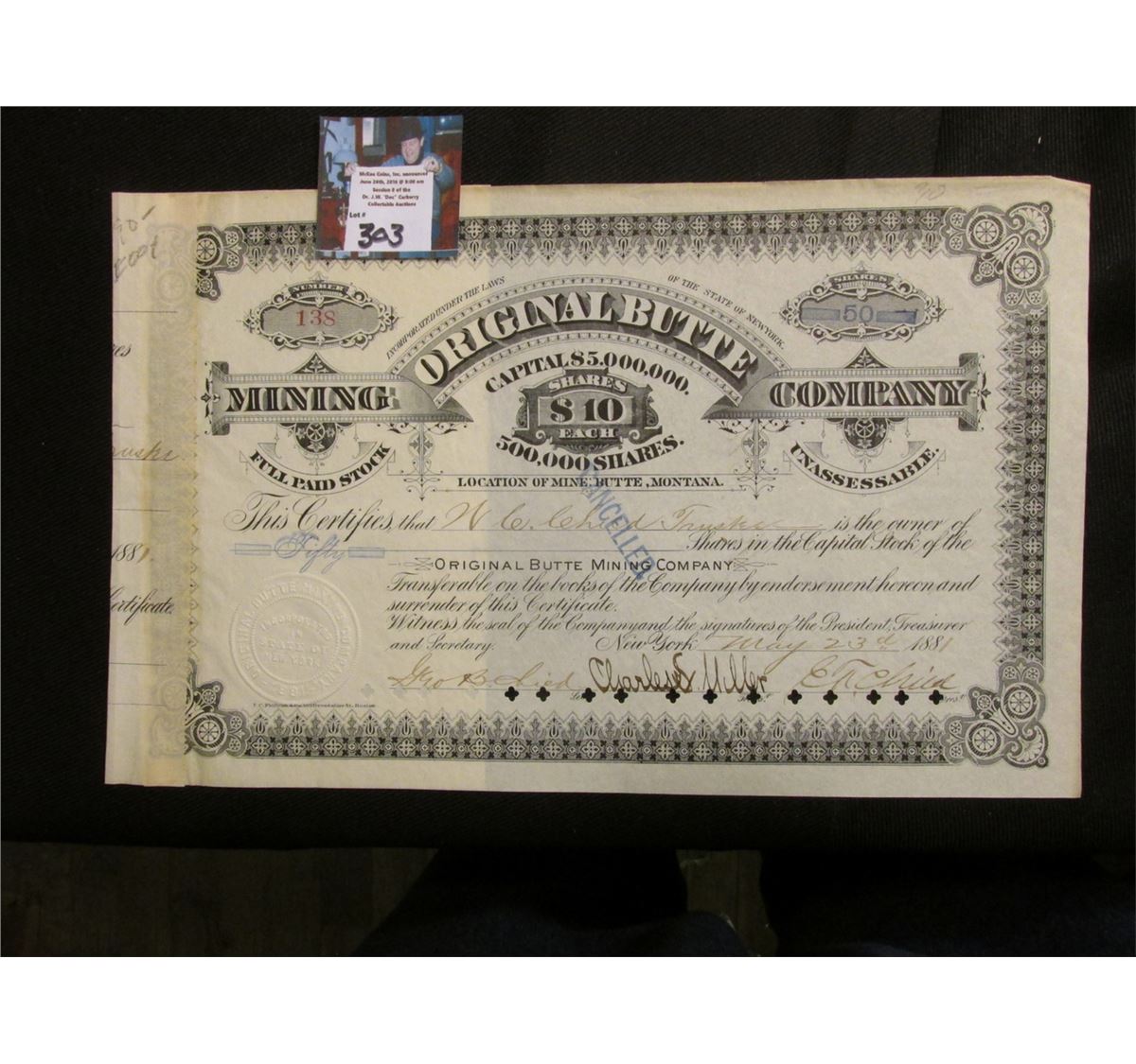 May 23rd, 1881 "Original Butte Mining Company Capital $5,000,000 Shares Each $10 Each 500,000 Shares." Cancelled. "Location of Mine, Butte, Montana.