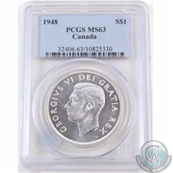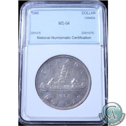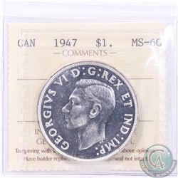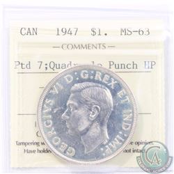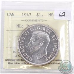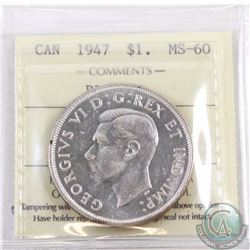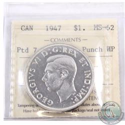 Silver $1 1947 Pointed 7 Double HP ICCS Certified MS-62. A nice clean coin with mirror fields.