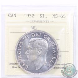 Silver $1 1952 WL ICCS Certified MS-65. A Lustrous coin with hints of toning throughout the borders.