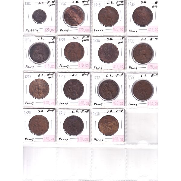 Great Britain Farthing & Penny 1885-1916 Bulk Lot Collection In 20-Pocket Sheet VF to EF-AU. 15pcs.