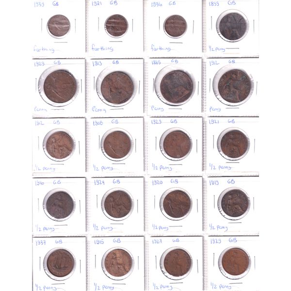 Great Britain Farthing, Halfpenny, Penny 1885-1939 Bulk Lot Collection In 20-Pocket Sheet. 20pcs.