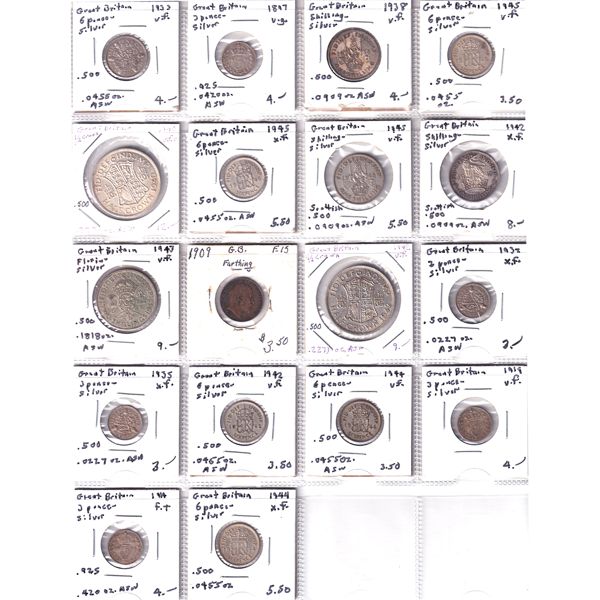 Great Britain Mixed Denomination 1897-1945 Bulk Lot Collection In 20-Pocket Sheet. 18pcs.