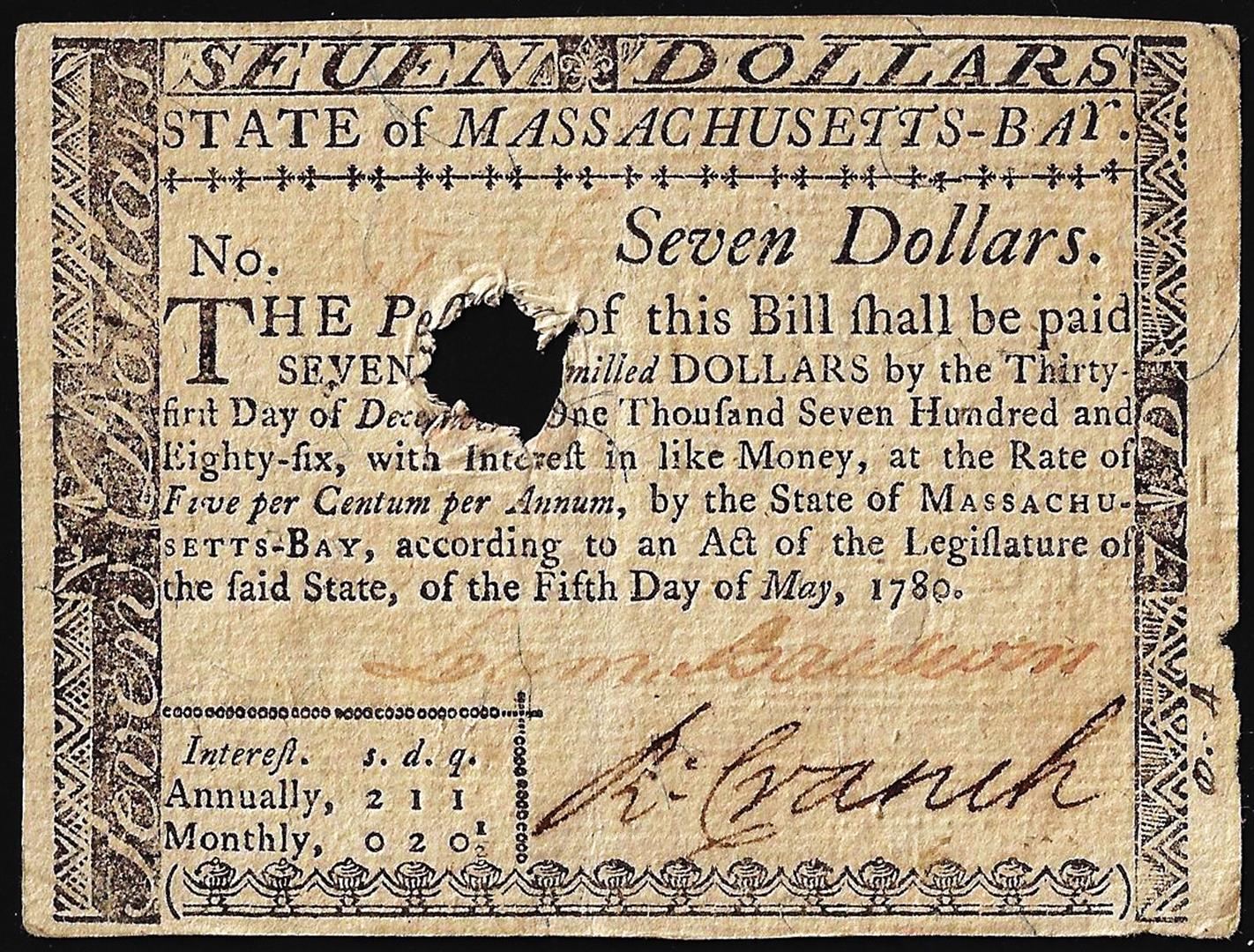 One May 5, 1780 $7 State of Massachusetts Colonial Currency Note.
