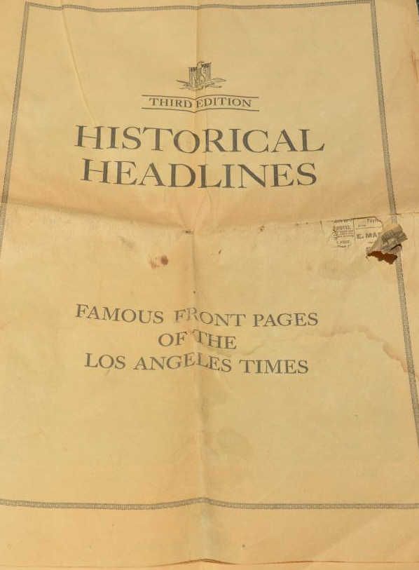 May 5, 1974 LA Times newspaper with complete text of the President’s Watergate Transcript in fair condition plus the third edition of “Historical Headlines” of famous front pages of the LA Times in worn and stained but readable condition.Est.: $50-$100.