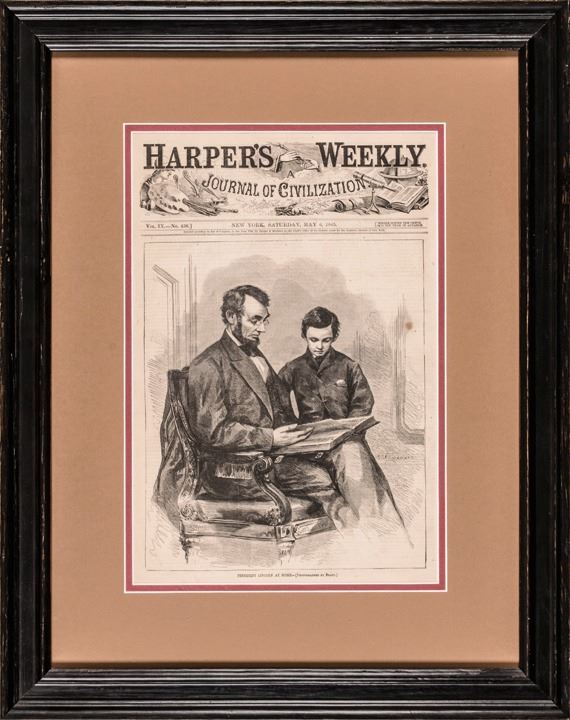 May 6, 1865-Dated, HARPER'S WEEKLY, New York, front page measuring 9.75” x 14.75” (by sight), professionally archivally matted and framed to fully 18.5” x 23.5” under Plexiglas. This historic memorial issue remains one of the most desired of the Civil War era, if not the 19th century, as much of it deals with the Assassination and subsequent funeral of President Abraham Lincoln. The entire front page is a print captioned: "President Lincoln At Home. - (After) (Photographed by Brady).” which shows him reading a book to his son Tad. This very image was also used on a postage stamp by the United States Post Office. Not examined out of frame.