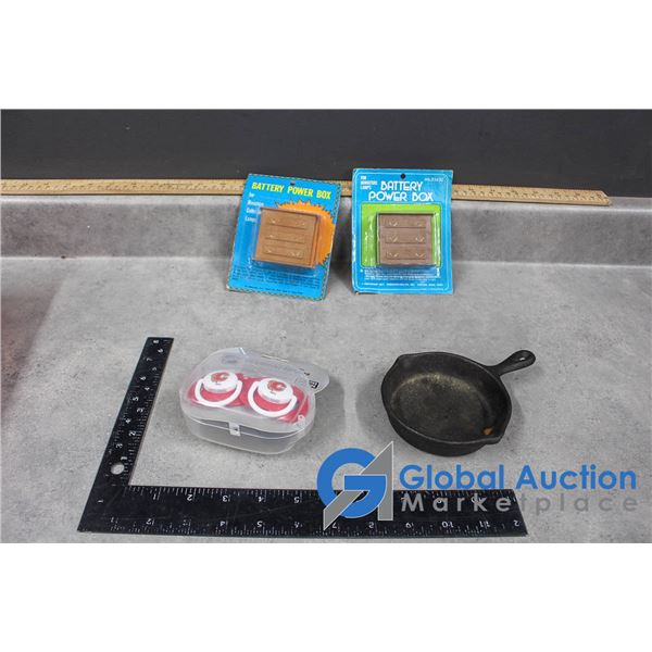 Salesman Cast Iron Pan, Battery Power Doll House Dressers, etc