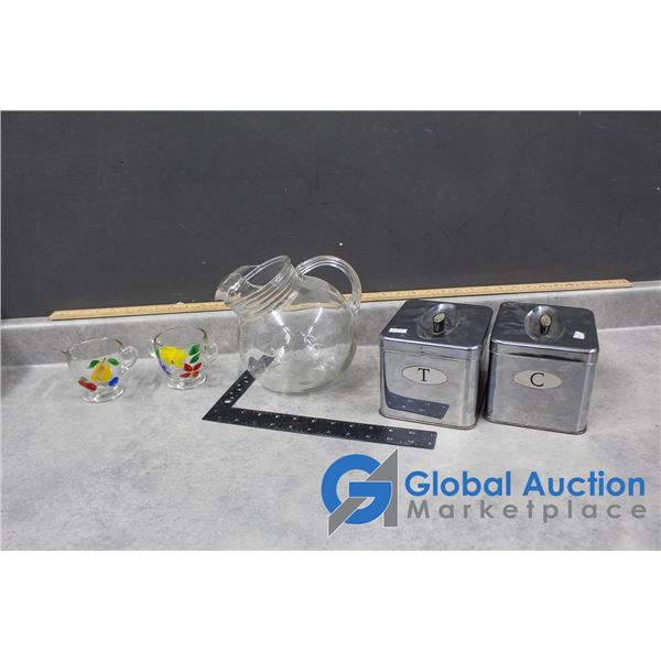 Vintage Coffee&Tea Tins, Glass Pitcher and Sugar&Creamer