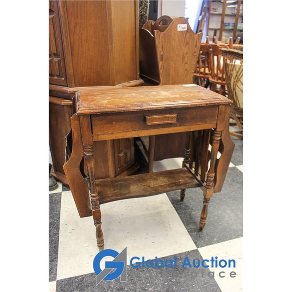 **Wooden Side Table w/Magazine Holder and Drawer