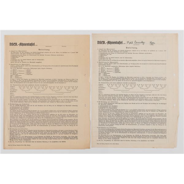 Two Aryan heritage charts from Germany from the National Socialist Teachers League (NSLB) to proof racial purity. One chart is filled out with the fam