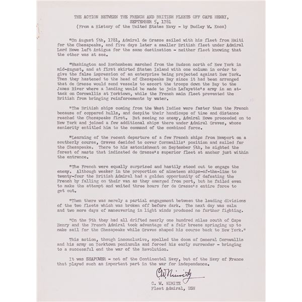 (1885-1966) Fleet admiral for the U.S. Navy in World War II. Typed document signed, 'The Action Between the French and British Fleets off Cape H...