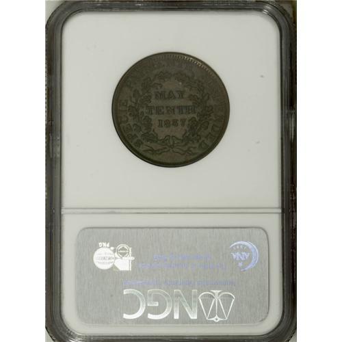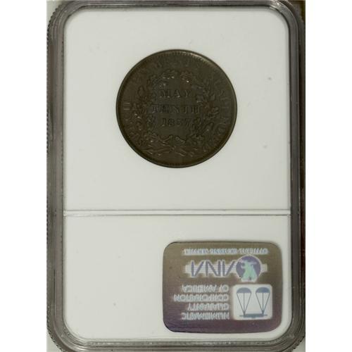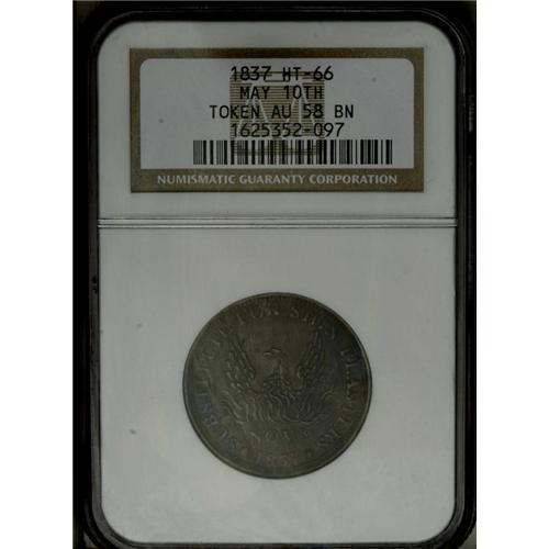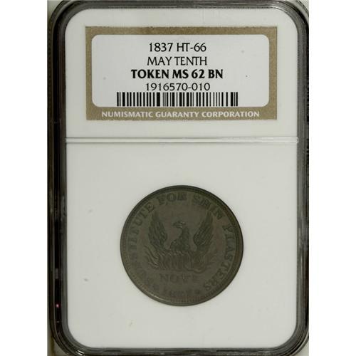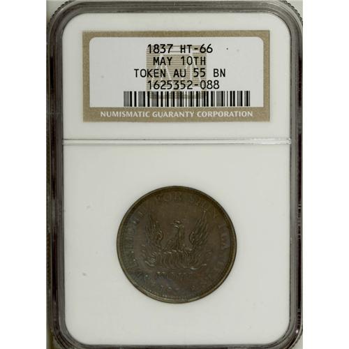 <B>May Tenth Hard Times Group Lot.</B></I> Consists of three HT-66 May Tenth tokens, one AU58, one MS62 Brown, and one AU55 Brown, all NGC-graded. Each has the SUBSTITUTED FOR SHIN PLASTERS peripheral legend with the phoenix rising from the flames motif. Catalog value is $250.<BR><BR><b>Shipping:</b> Coin/Currency (<a target="_blank" href="http://www.heritageauctions.com/common/shipping.php">view shipping information</a>)
