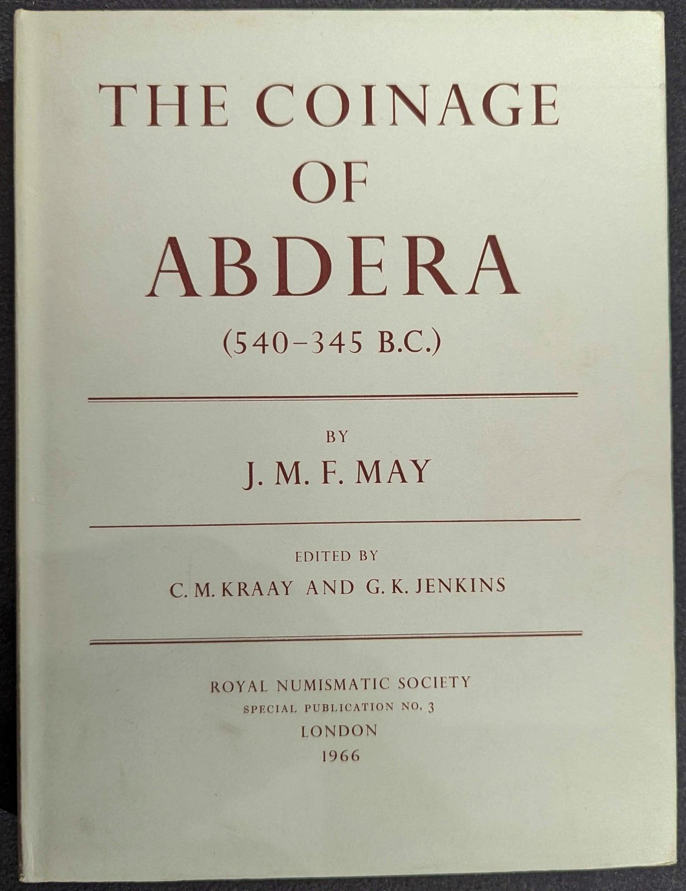 May, J.M.F. & C.M. Kraay (Ed.) & G.K. Jenkins (Ed.). THE COINAGE OF ABDERA (540-345 B.C.). Royal Numismatic Society. 1966. Crown 4to. xi, (1), 298, (2) pages. London. First edition. original red cloth, gilt; dust jacket. 24 fine plates. Fine. Royal Numismatic Society Special Publication No. 3. After completing his study of the mint of Ainos in 1950 J. M. F. May turned his attention to the still more difficult problems presented by the very varied issues of Abdera on the north Aegean coast; at the time of his premature death in 1961 his work was very nearly complete and has required only minor editorial revision. On the basis of the largest possible body of material, May has re-established the sequence of issues between the foundation of Abdera in 544 B.C. and its capture by Philip II of Macedon c. 350 B.C. He has also devoted particular attention to elucidating the reasons for the frequent changes in the weight standards on which the coins were struck, and to relating the coinage to its contemporary background. Since similar factors affected both Ainos and Abdera, the present work forms a complement to his earlier study. The plates illustrate almost 500 coins, which include nearly all known dies of this mint. Lot weight: 2 lbs 11oz. Subject(s): Ancient Coinage.