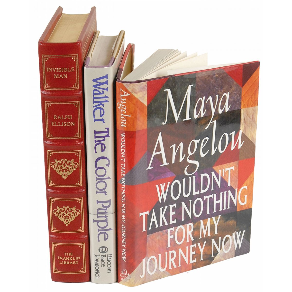 Three books: a hardcover first edition of Wouldn’t Take Nothing for My Journey Now, signed on the title page by Maya Angelou in black ballpoint; a hardcover first edition of The Color Purple, signed on the title page by Alice Walker; and a leatherbound Franklin Mint limited edition of Invisible Man, signed on the first free end page by Ralph Ellison. In overall fine condition. A wonderful grouping of these icons of African-American literature.