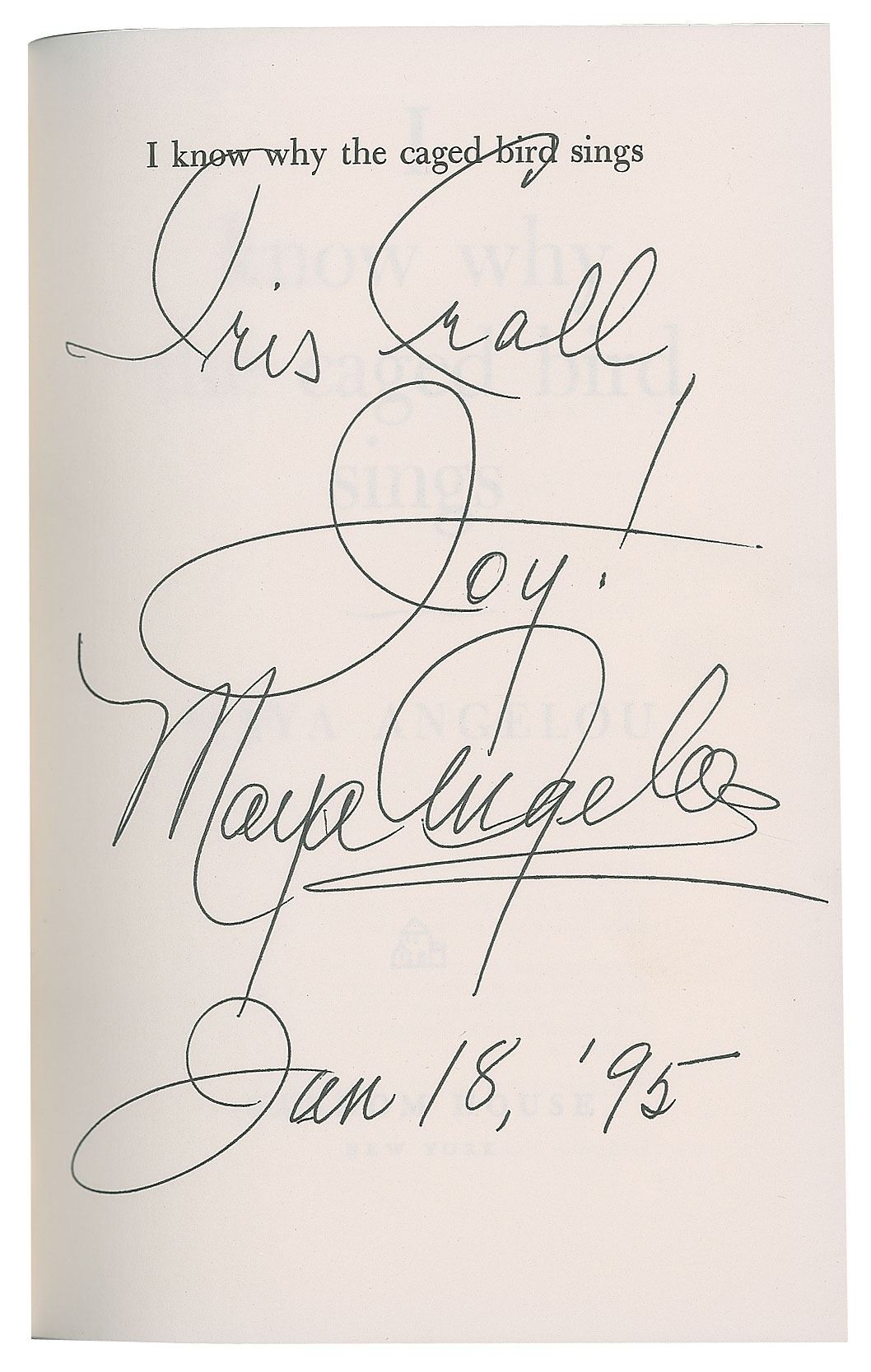 Signed book: I Know Why the Caged Bird Sings. Later printing. NY: Random House, 1969. Hardcover with dust jacket, 5.75 x 8.5, 281 pages. Signed and inscribed on the half-title page in black felt tip, "Cris Crall, Joy! Maya Angelou, Jan 18, '95." In fine condition.