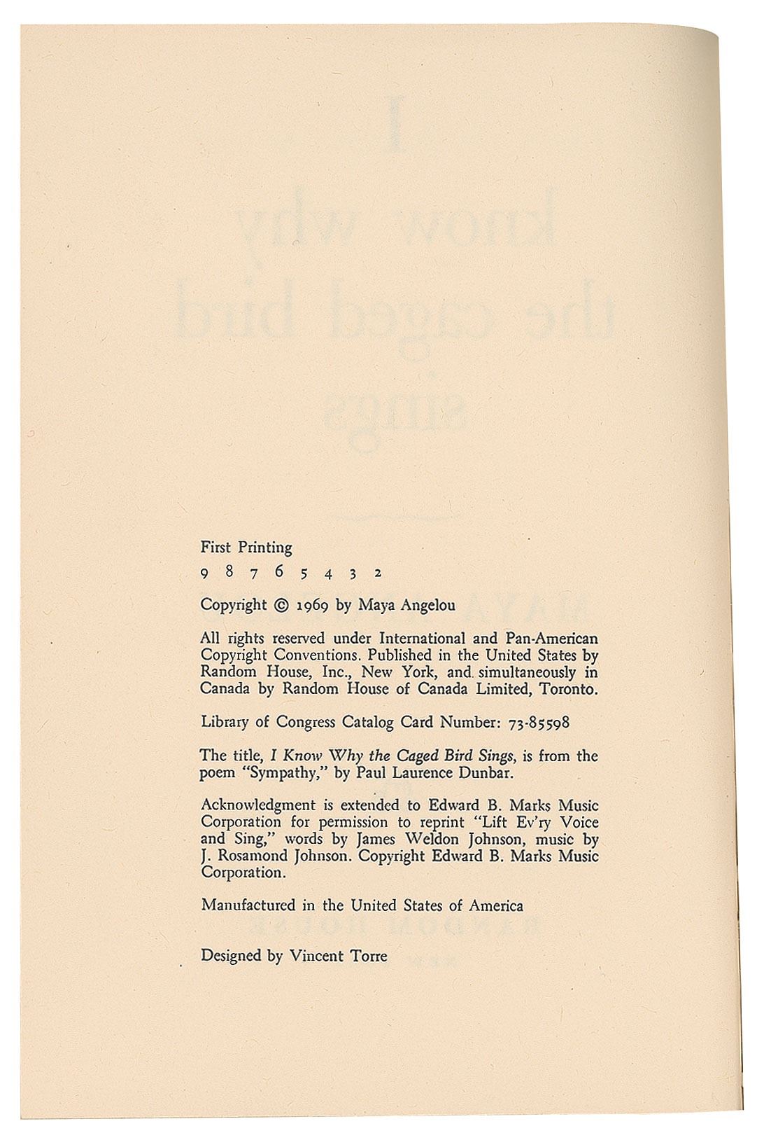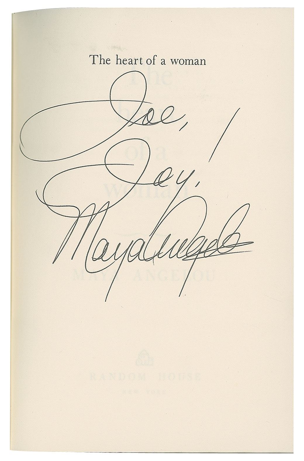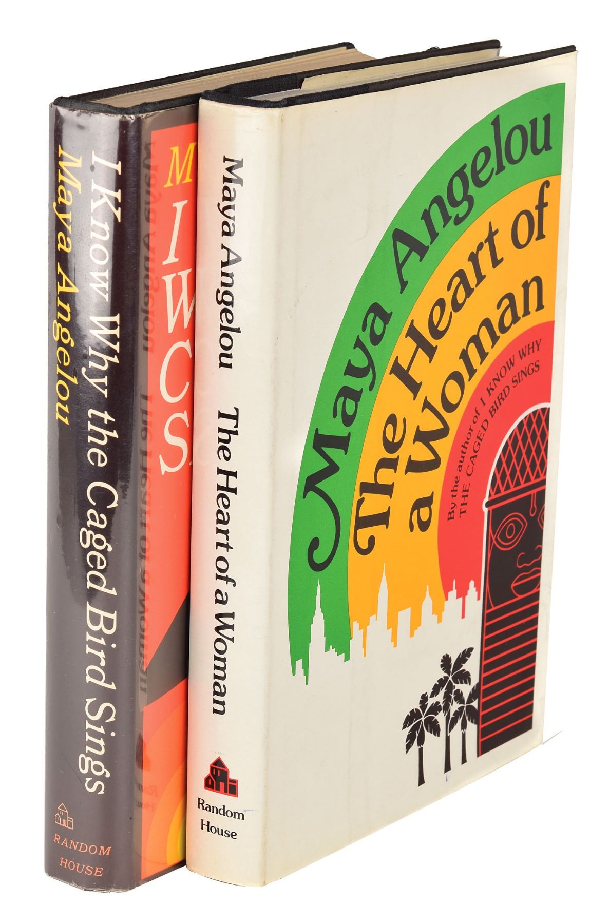 Two books: an unsigned first edition of I Know Why the Caged Bird Sings, hardcover with price-clipped dust jacket, published by Random House in 1969; and a first edition of The Heart of a Woman, hardcover with dust jacket, published by Random House in 1981, signed and inscribed on the half-title page in black ink, "Joe, Joy! Maya Angelou." In overall fine condition.