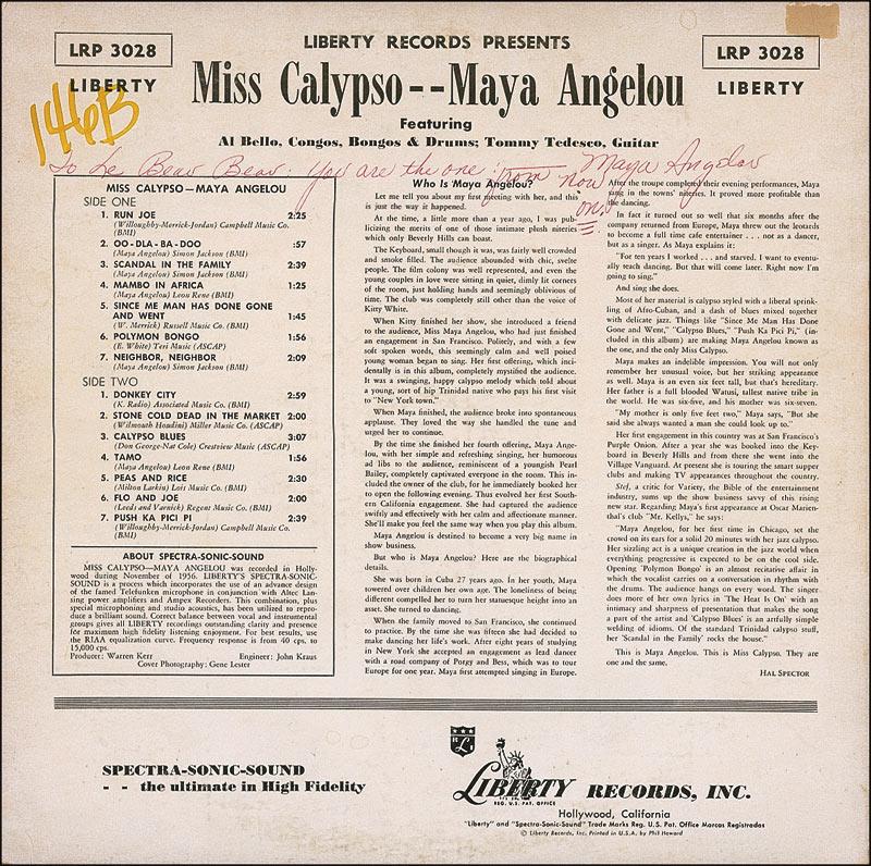 Miss Calypso album signed and inscribed on the back cover, “To Le Beau Beau: You are the one: from now on. Maya Angelou.” In fine condition, with light toning and foxing to back cover, felt tip notation above signature, and a small label remnant. The record is included.