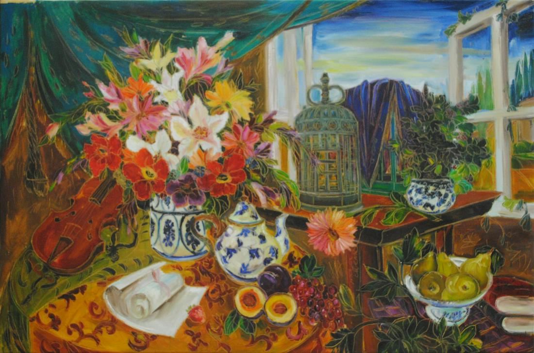 Maya immigrated to Canada in 1990 where she now resides with her husband and two children. Her style has evolved during her life in Canada. She loves the rich, bold and bright colors of the Mediterranean and often portrays scenes from her travels in her paintings. Maya developed her unique technique of etching on oil after being inspired by the Faberge Eggs that fascinated her as a child when she saw them in the museum. Image- 39" x 59".